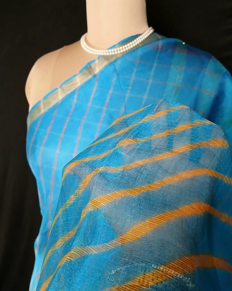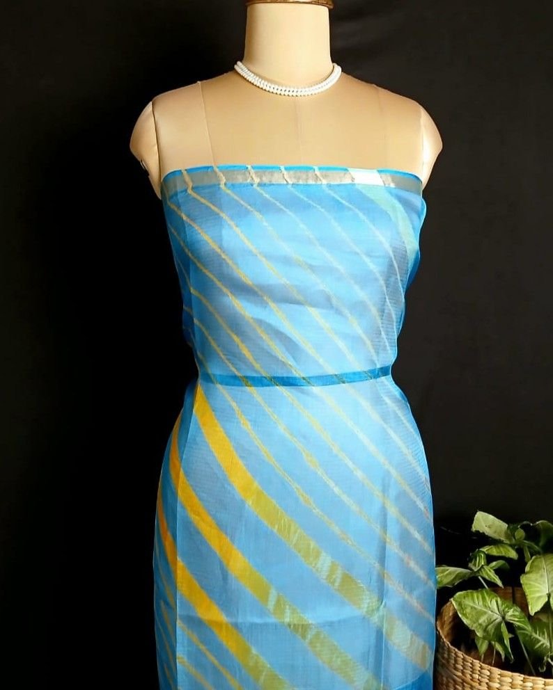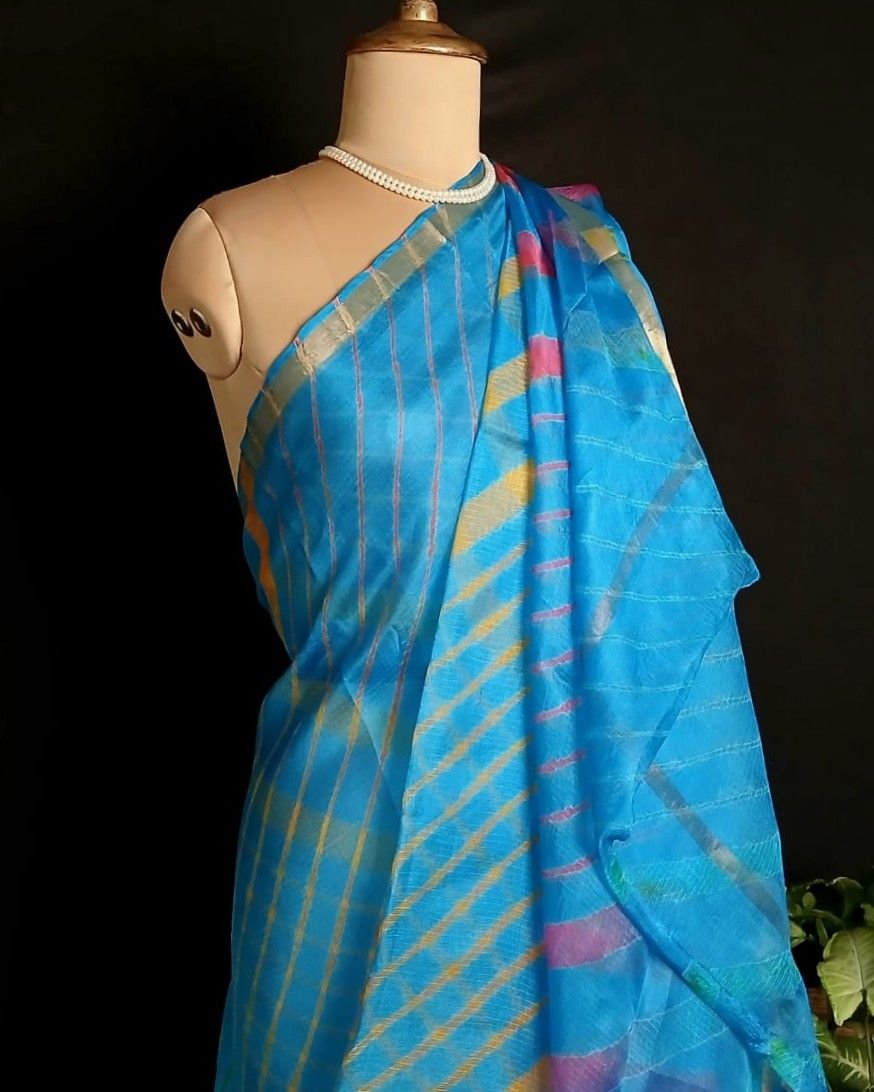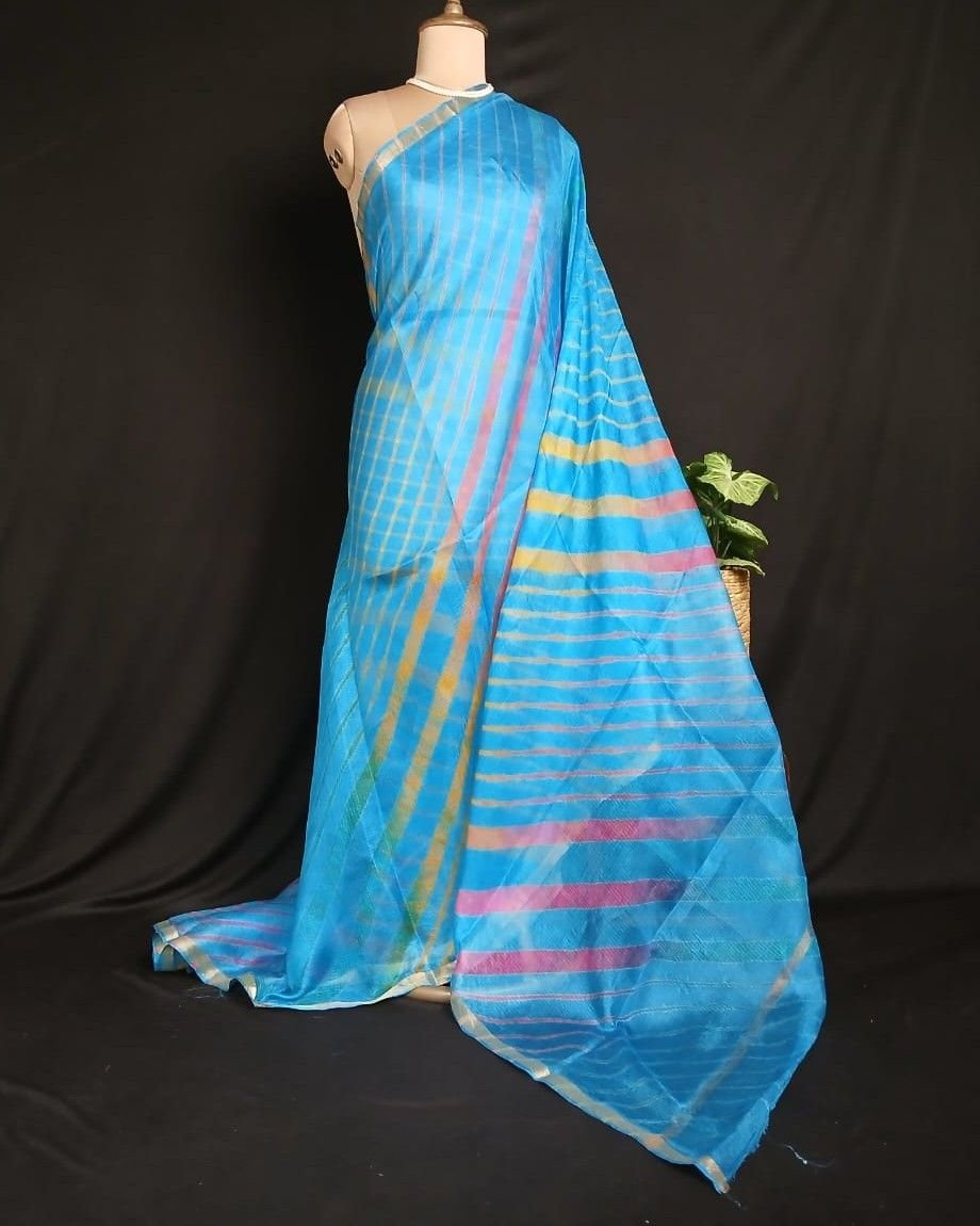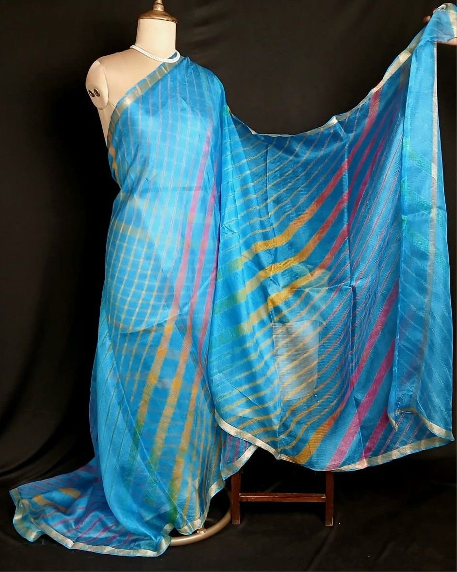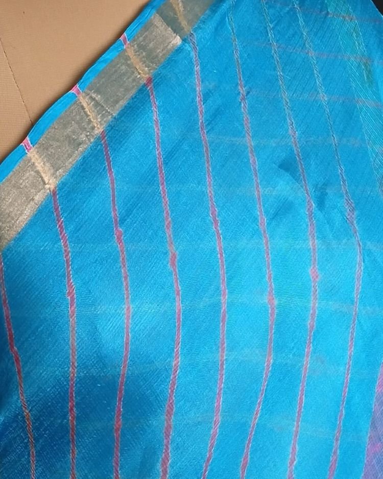 Hand tie-dye Leheriya on Kota Silk. Made in Jaipur in a lovely combination, showing the artisan’s skilled understanding of colour interplay.