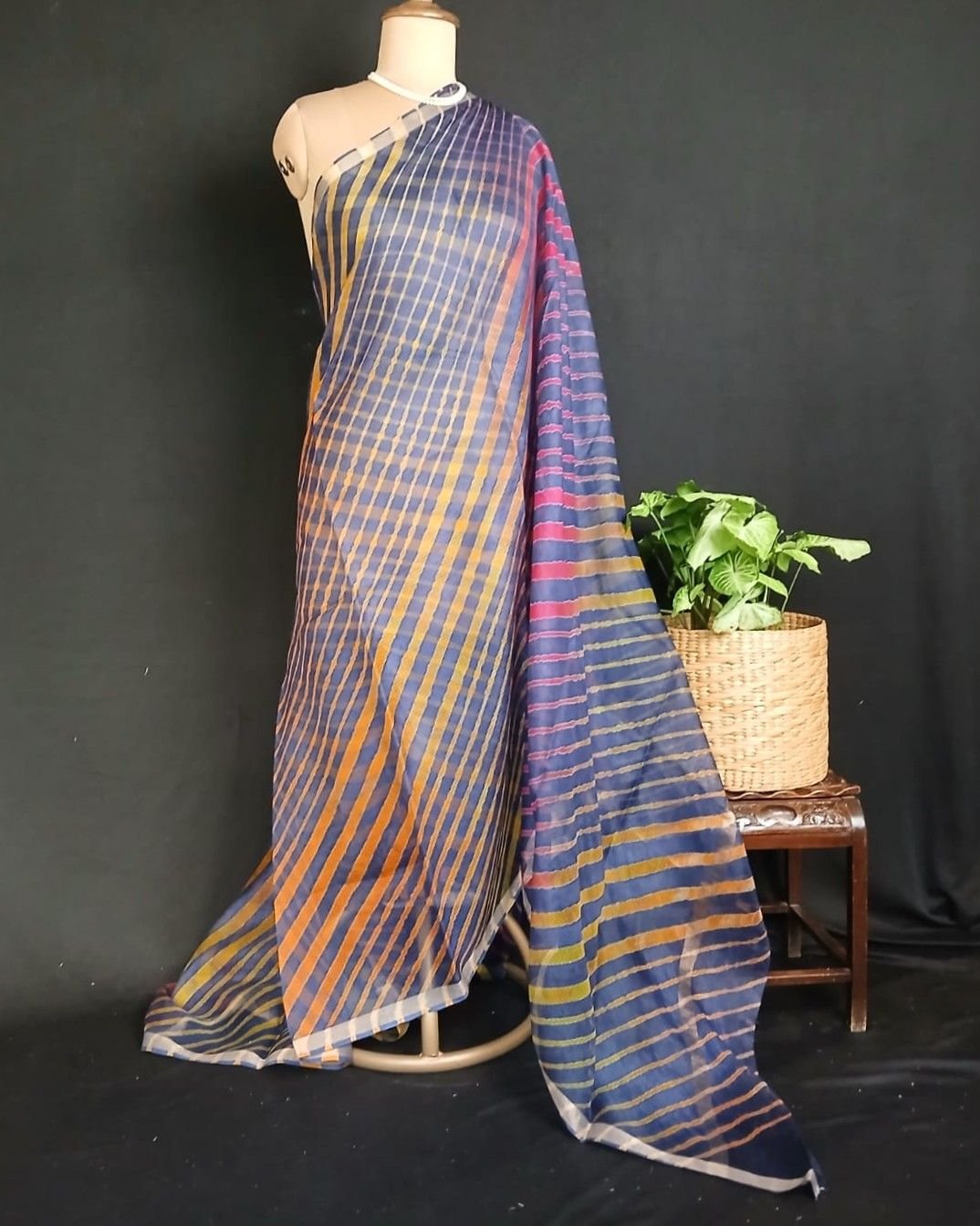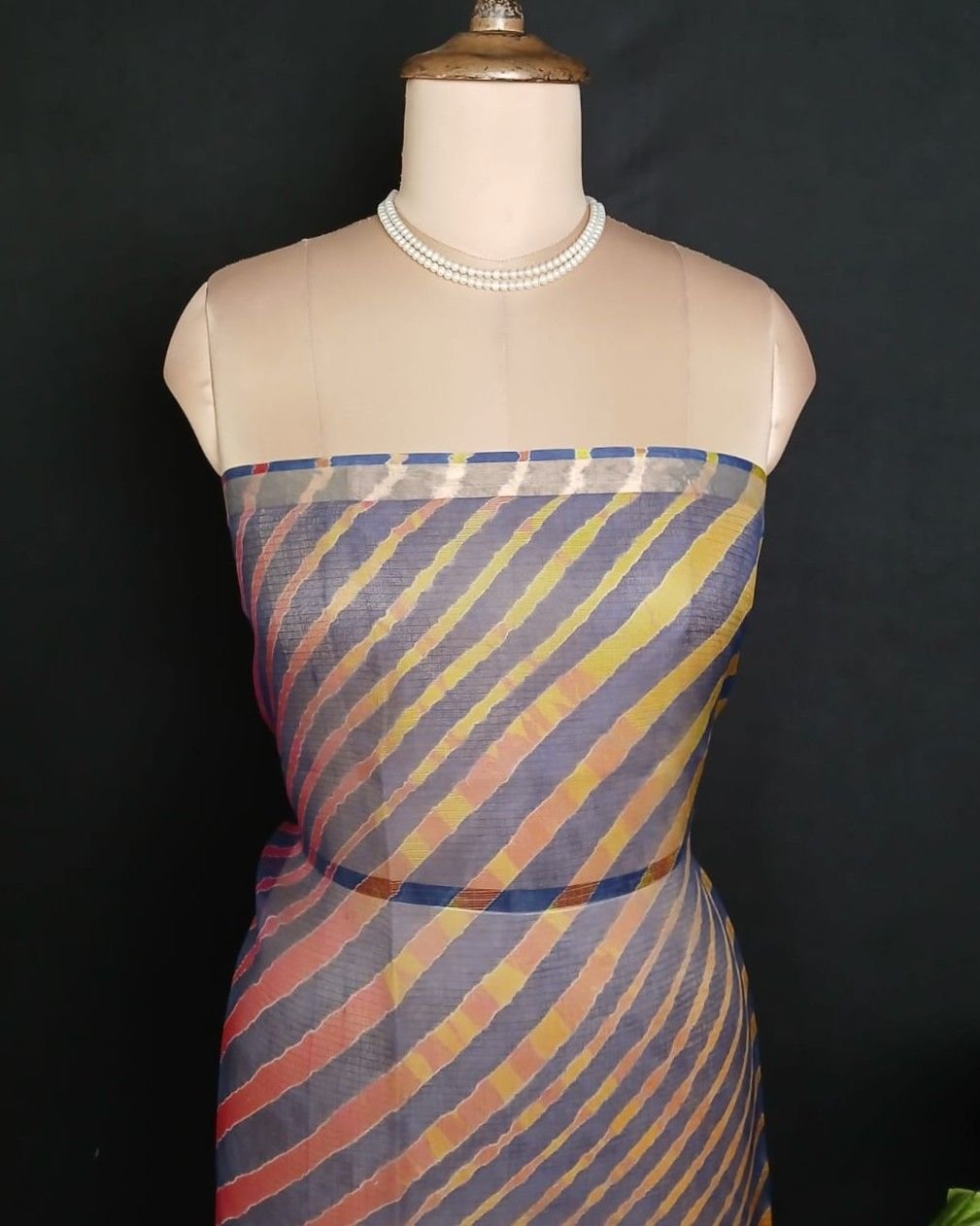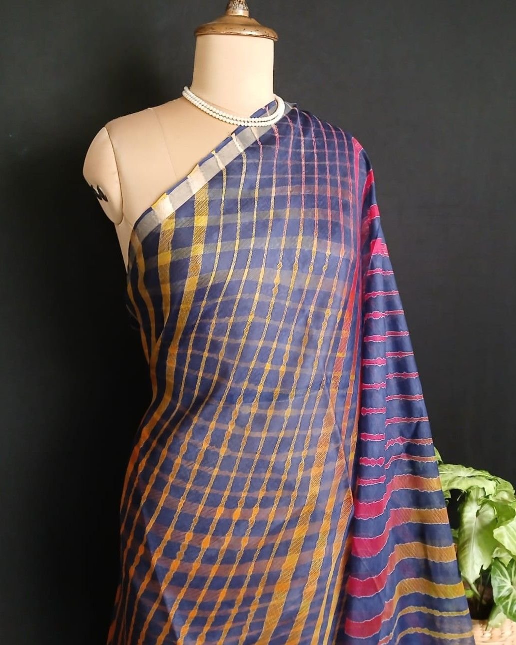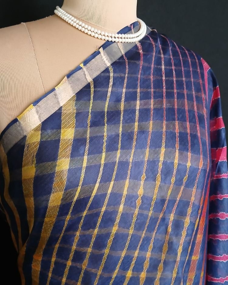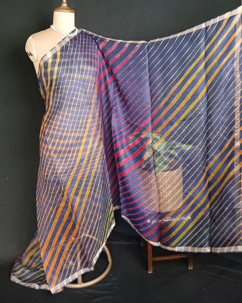 Hand tie-dye Leheriya on Kota Silk. Made in Jaipur in a lovely combination, showing the artisan’s skilled understanding of colour interplay.