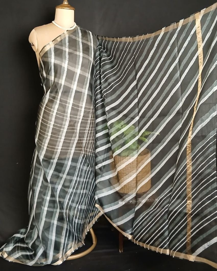 Hand tie-dye Leheriya on Kota Silk. Made in Jaipur in a lovely combination, showing the artisan’s skilled understanding of colour interplay.