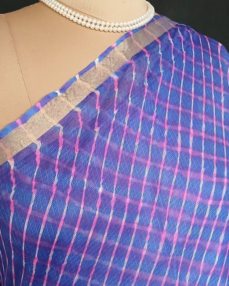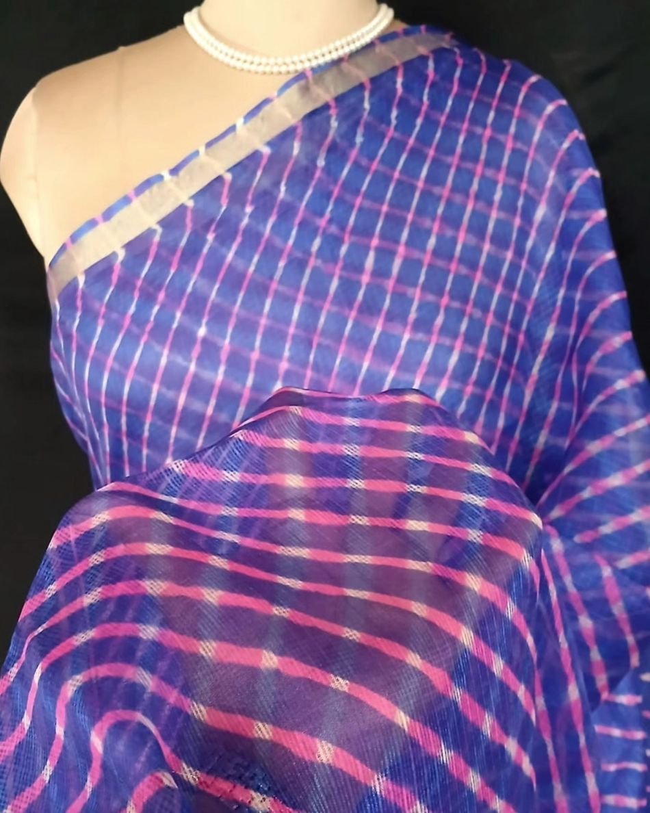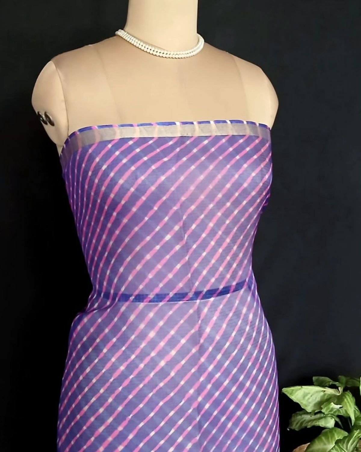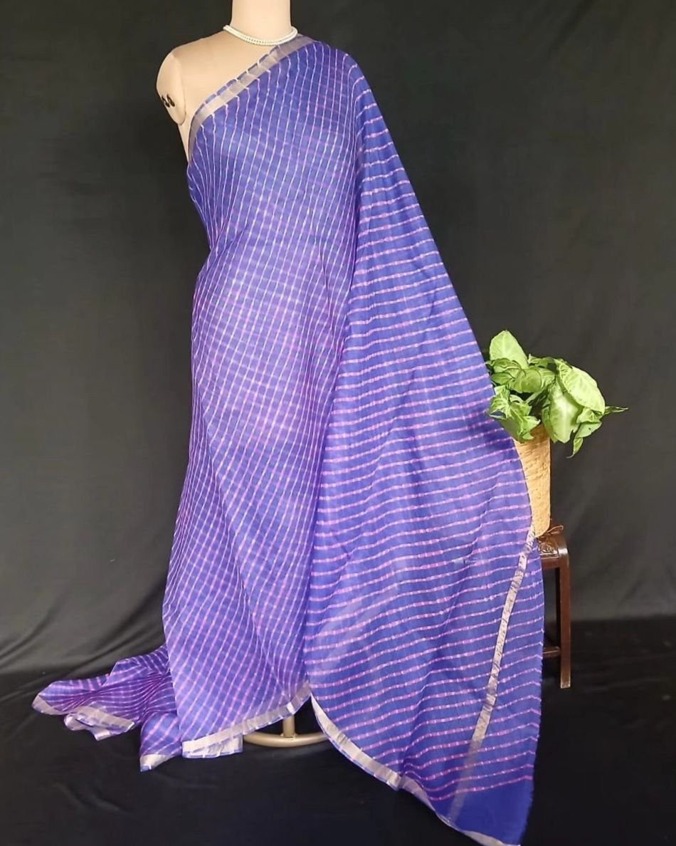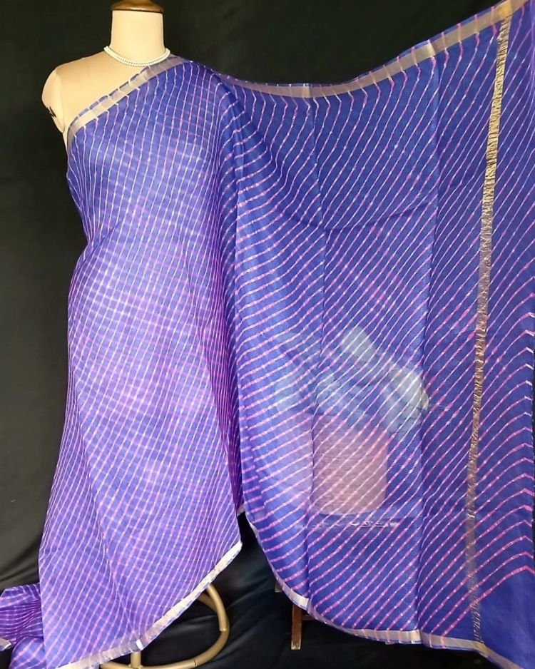 Hand tie-dye Leheriya on Kota Silk. Made in Jaipur in a lovely combination, showing the artisan’s skilled understanding of colour interplay.