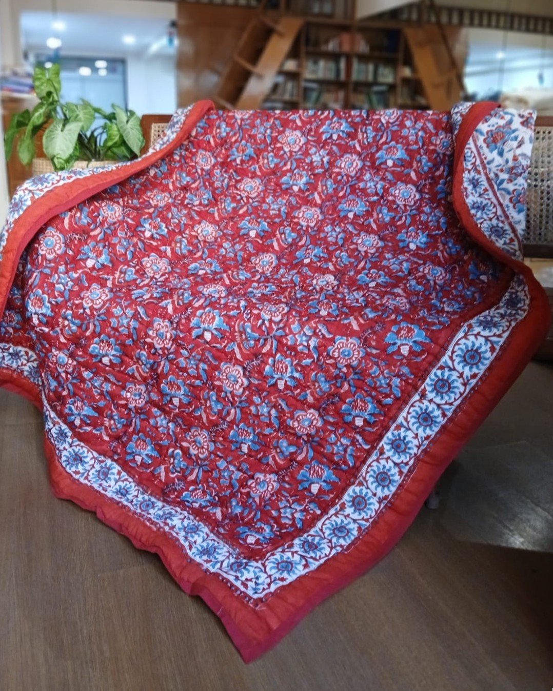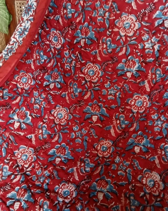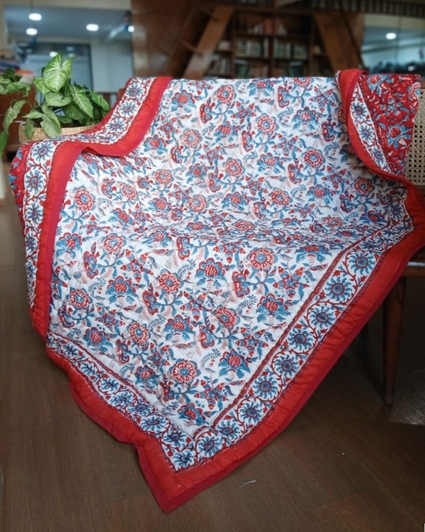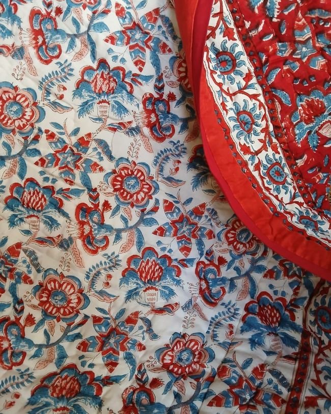 Handblock Print Reversible Single Razai from Jaipur. Very soft mul cotton exterior, with cotton filling.