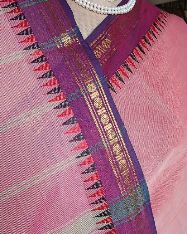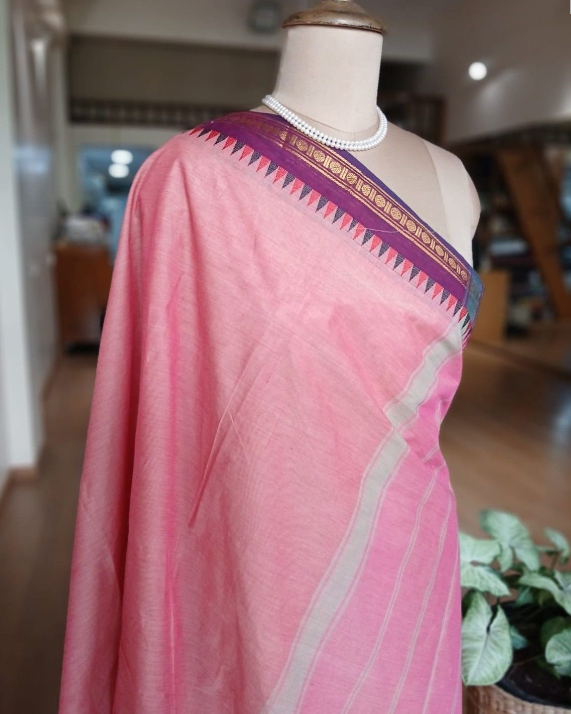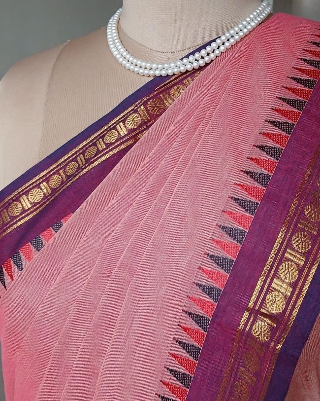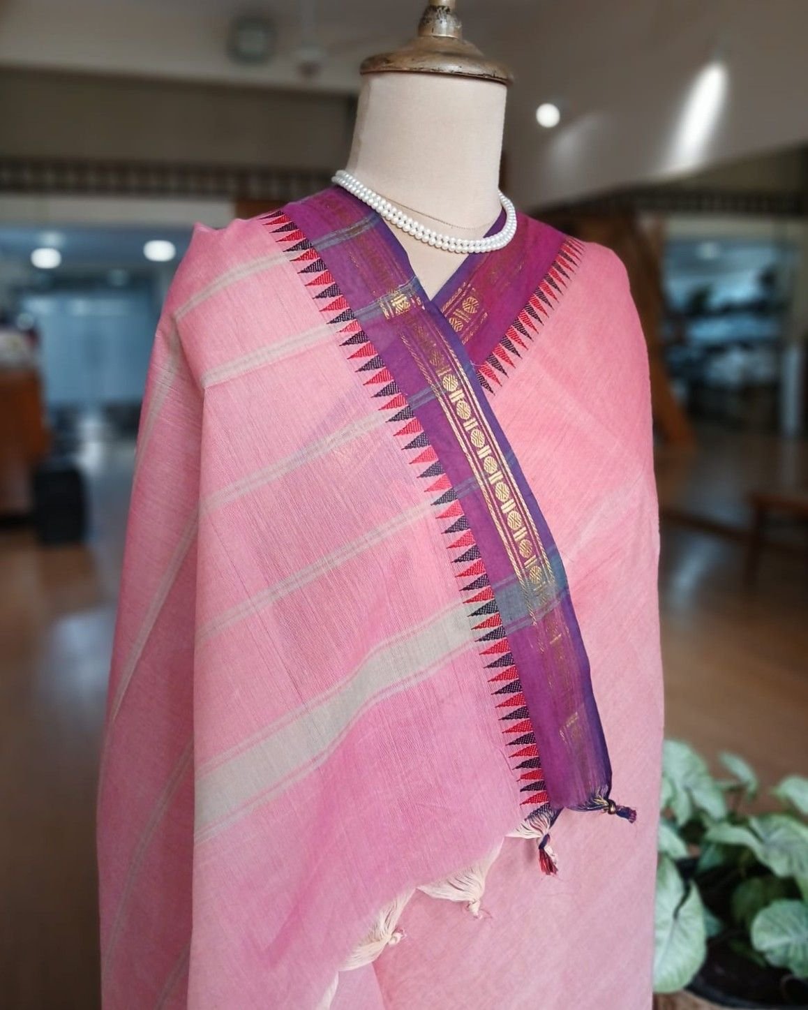 Handweave Cottons from Karaikudi in Tamil Nadu, with woven zari borders and temple border, plain body and striped palla.