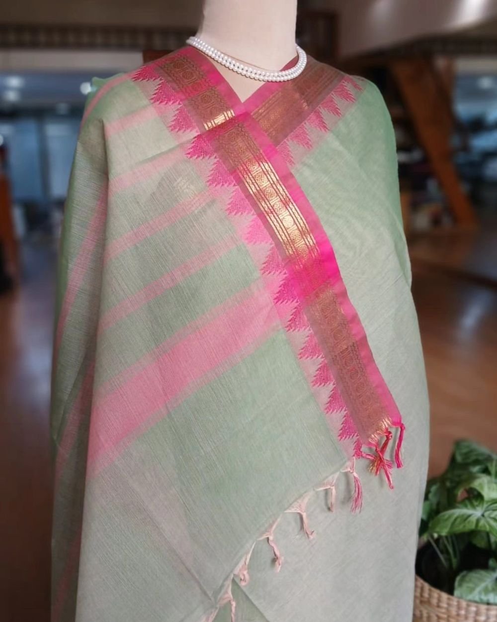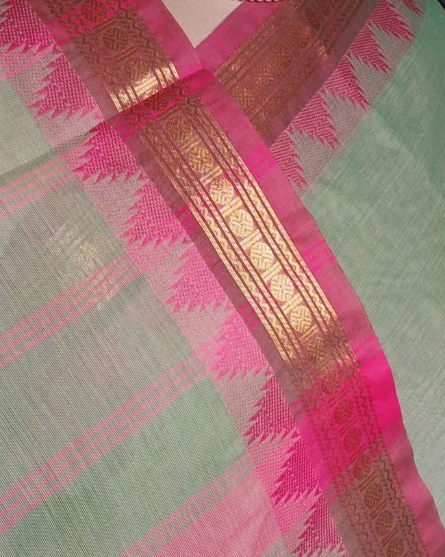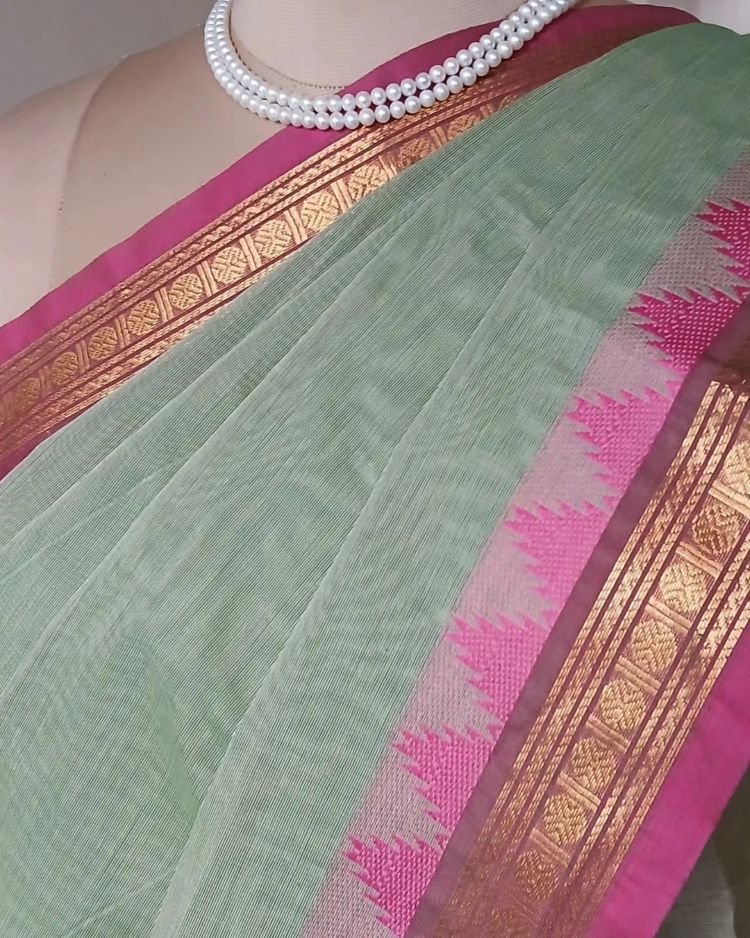 Handweave Cottons from Karaikudi in Tamil Nadu, with woven zari borders and temple border, plain body and striped palla.