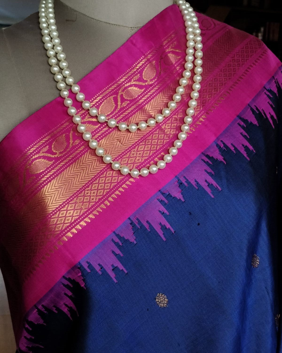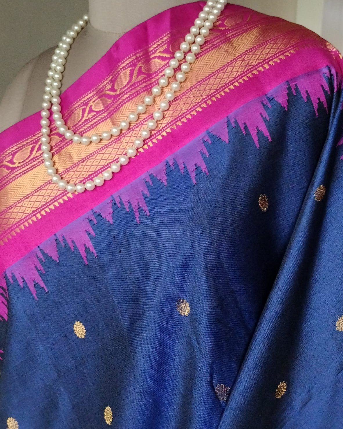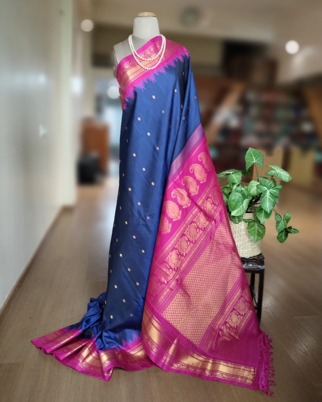 Gadwal handweave silk sarees with kuttu borders, zari buttis and grand palla. There is a contrast blouse in the palla colour