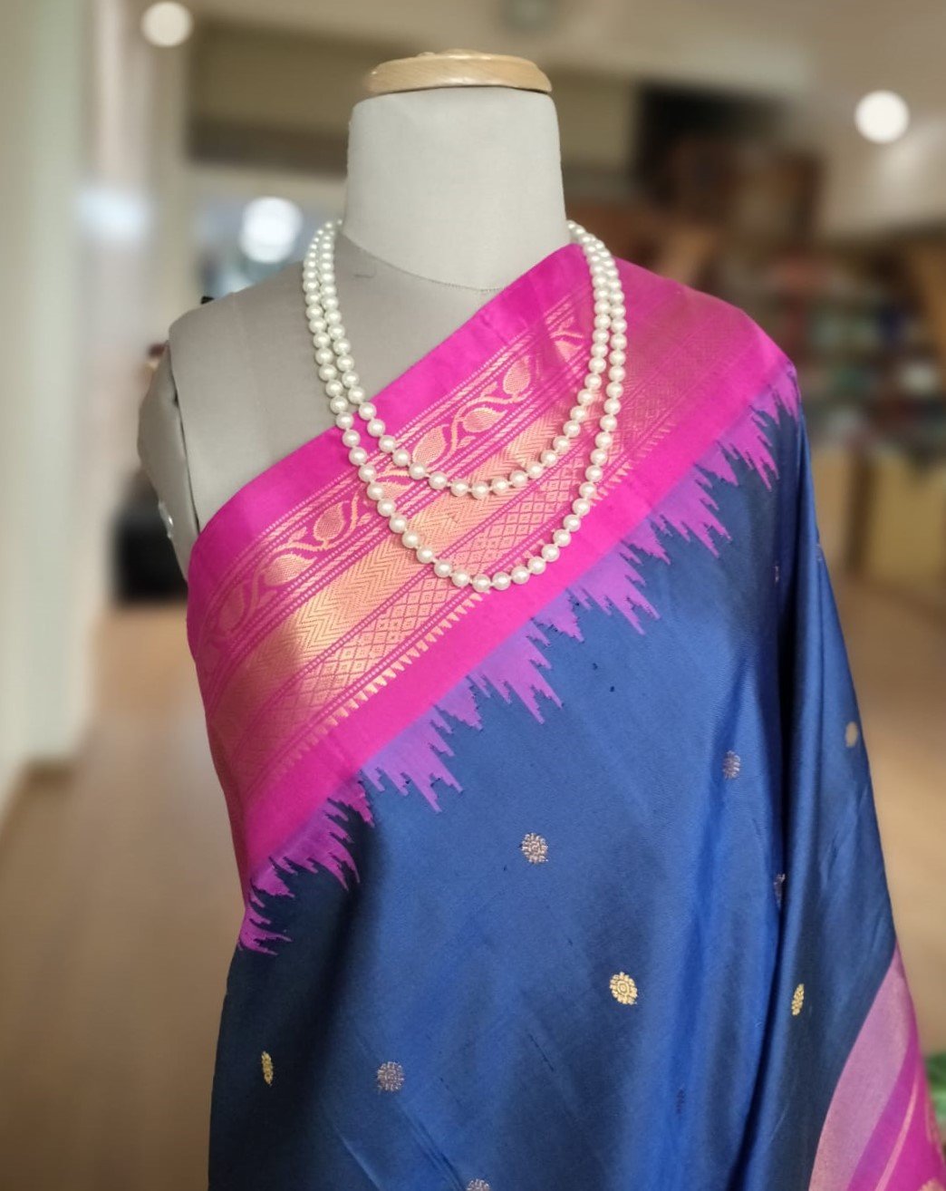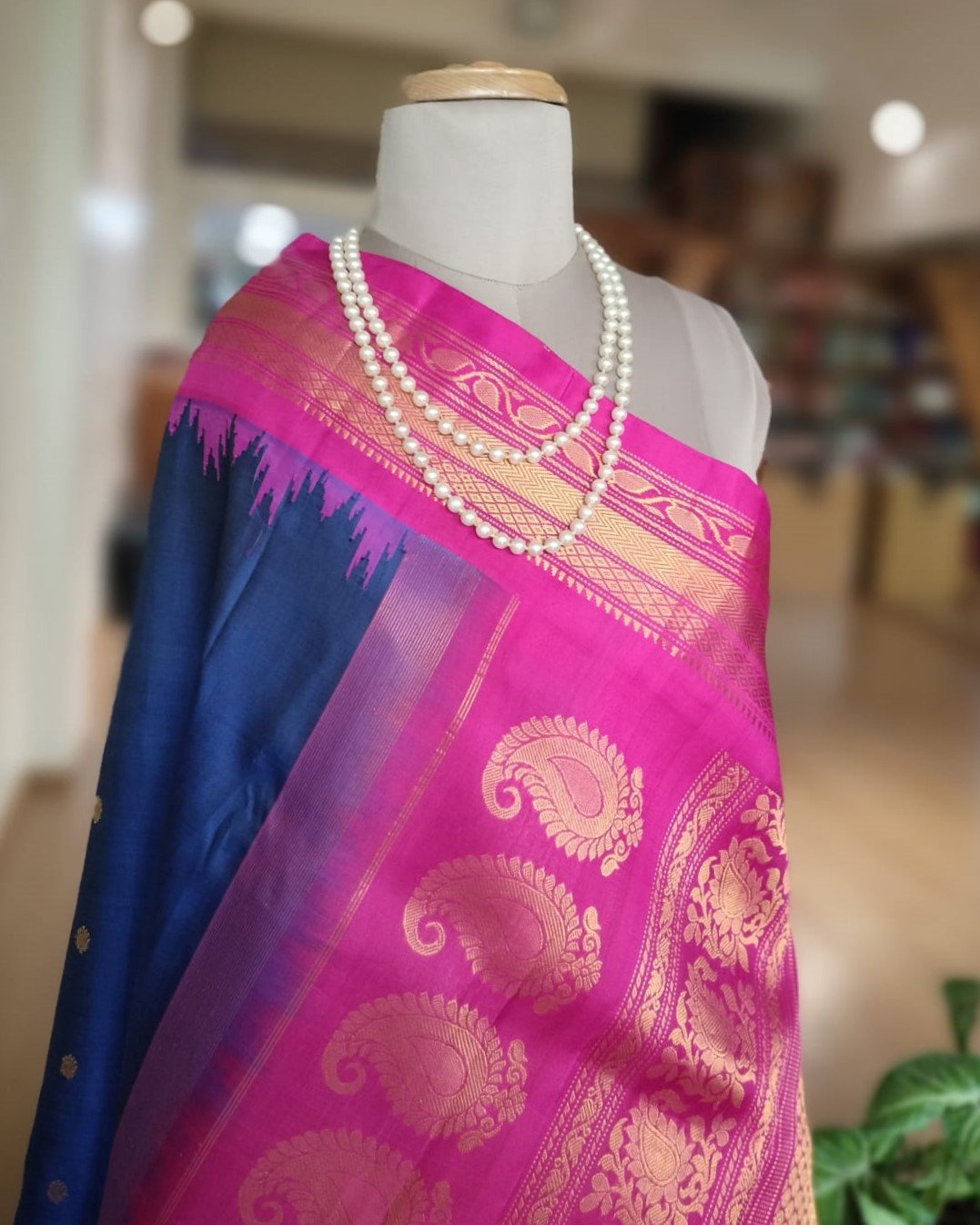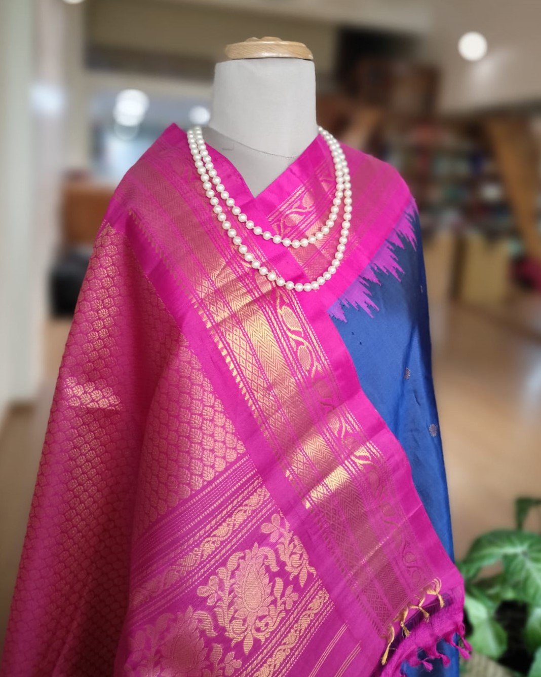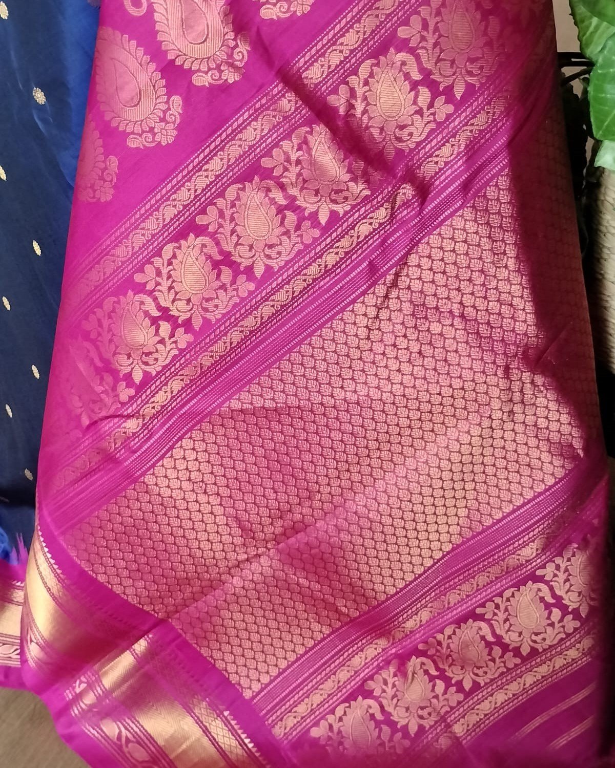 Gadwal handweave silk sarees with kuttu borders, zari buttis and grand palla. There is a contrast blouse in the palla colour