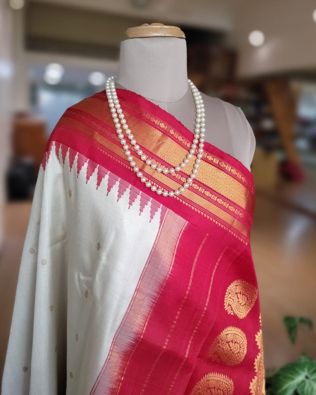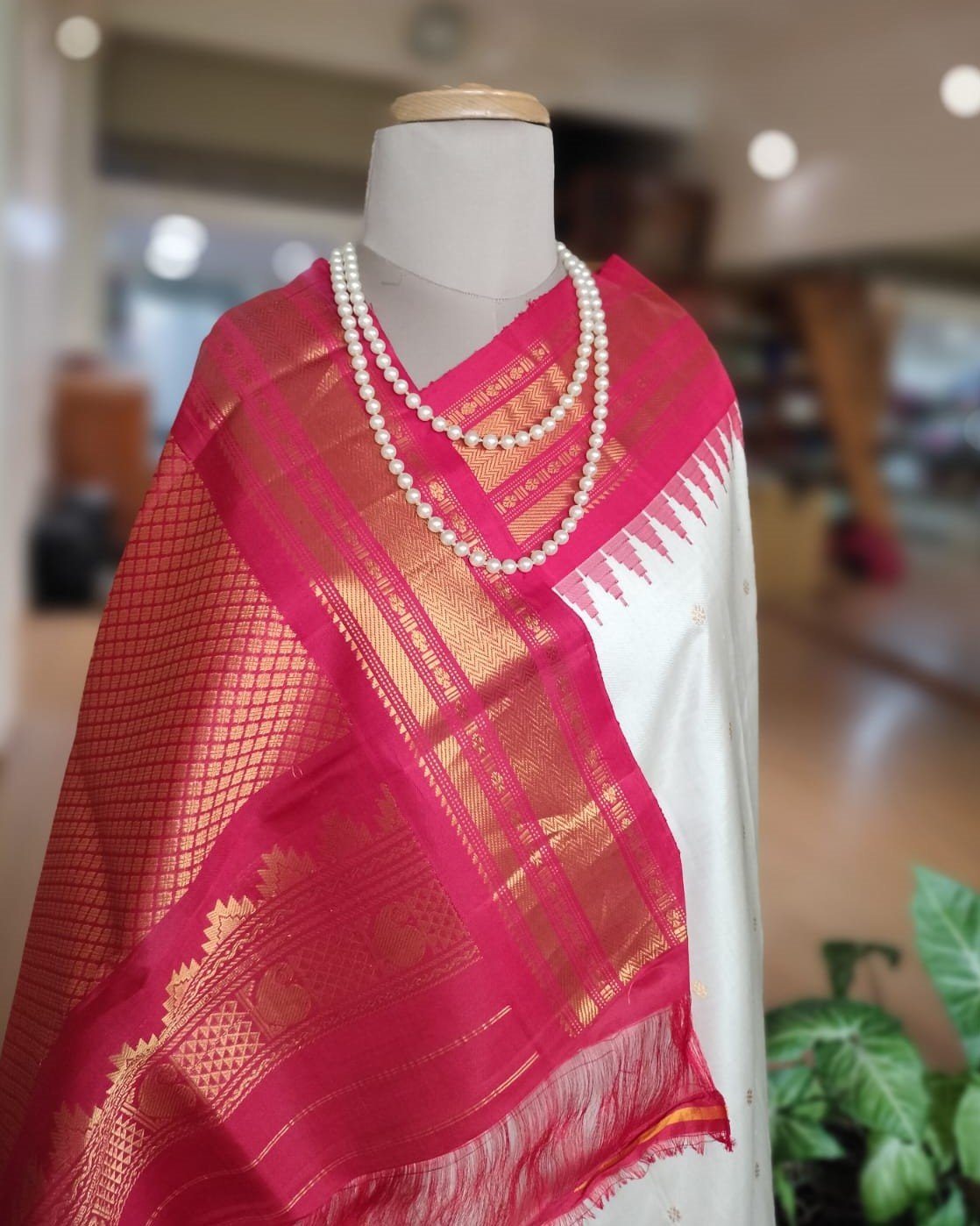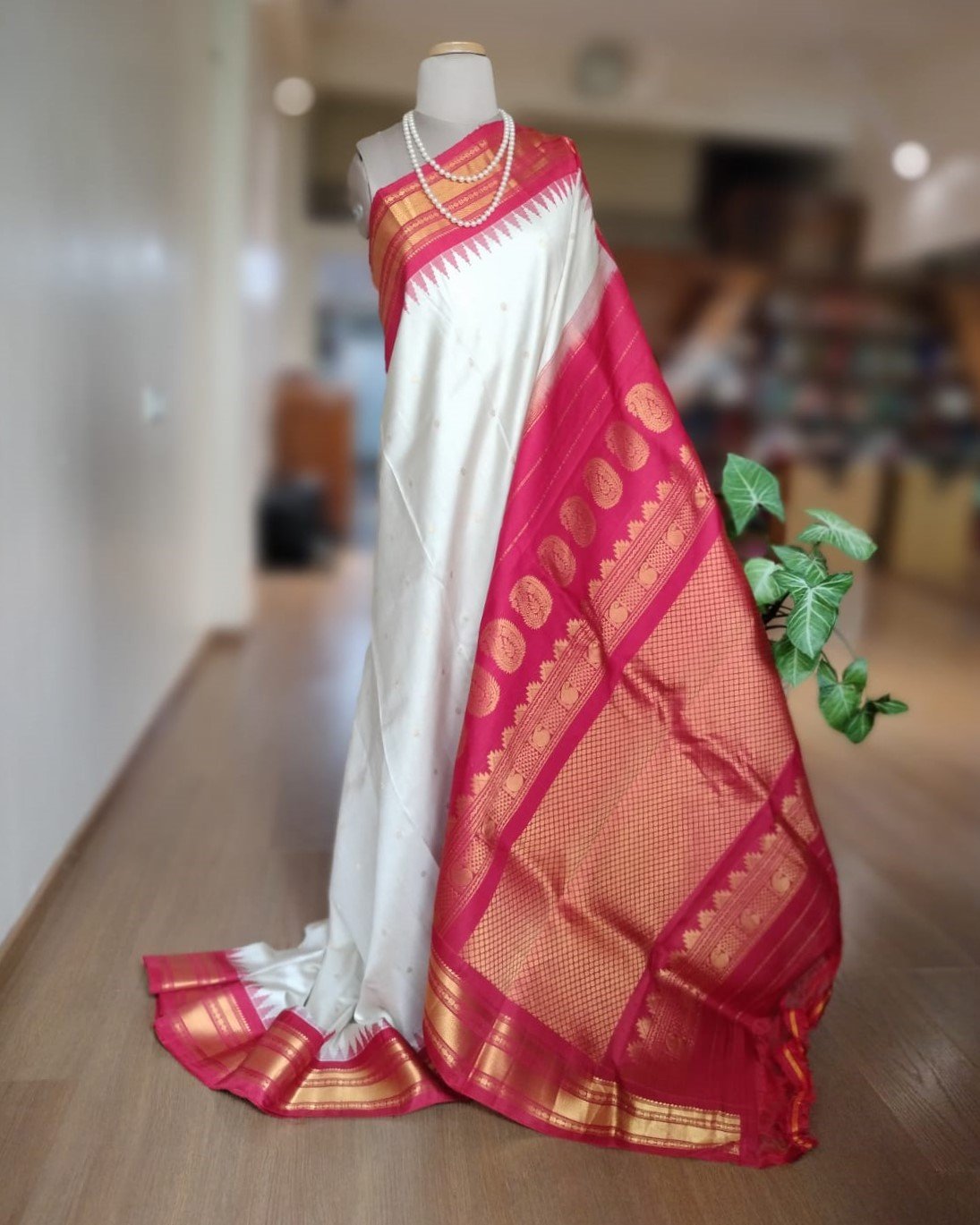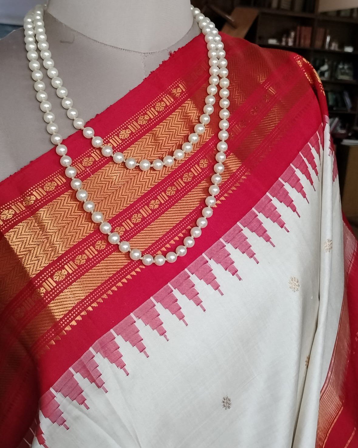 Handweave Gadwal Silk Saree – Offwhite and Red (2)