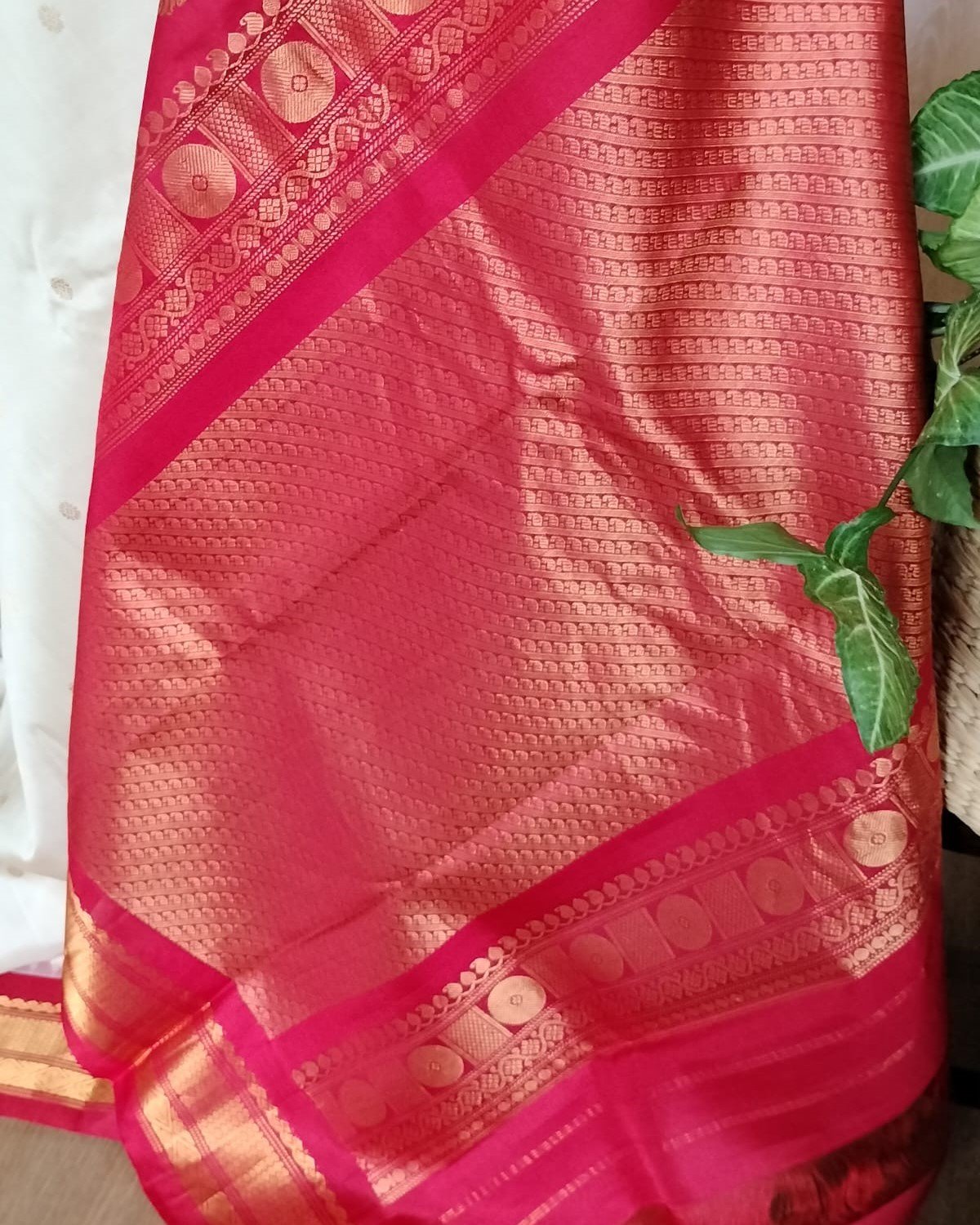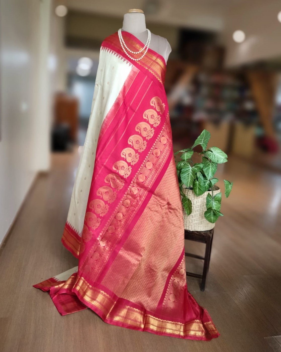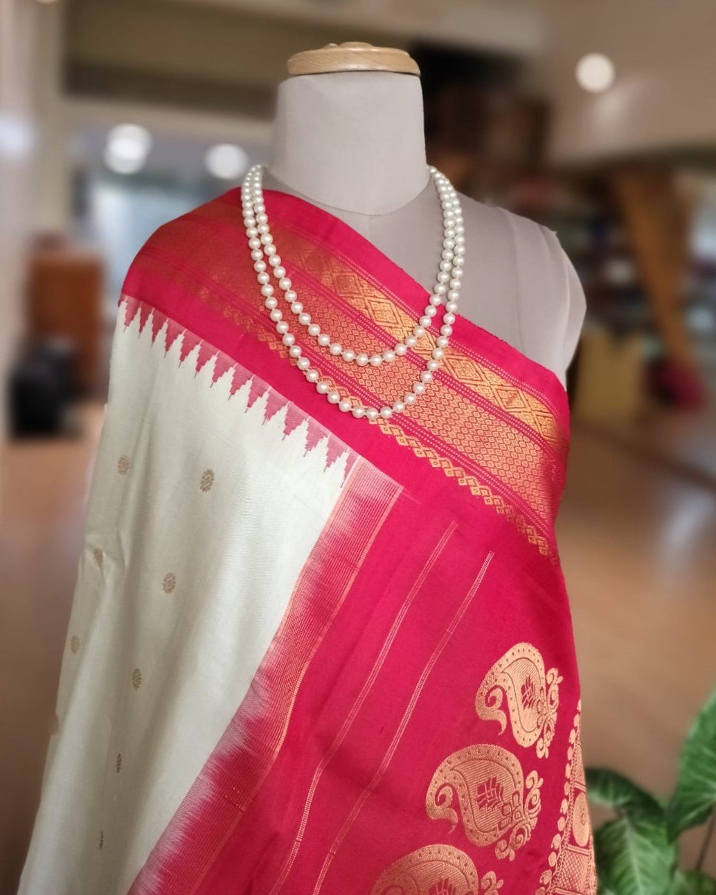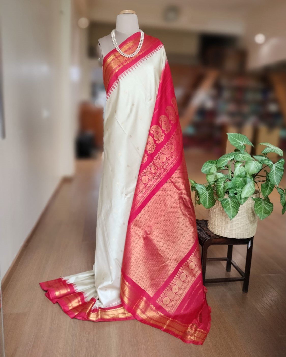 Handweave Gadwal Silk Saree – Offwhite and Red