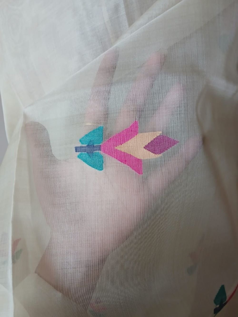 Hand jamdani from Phulia using the skilled needle jamdani technique. The weavers came from Tangail in Bangladesh during partition of India and also during the 1971 war.