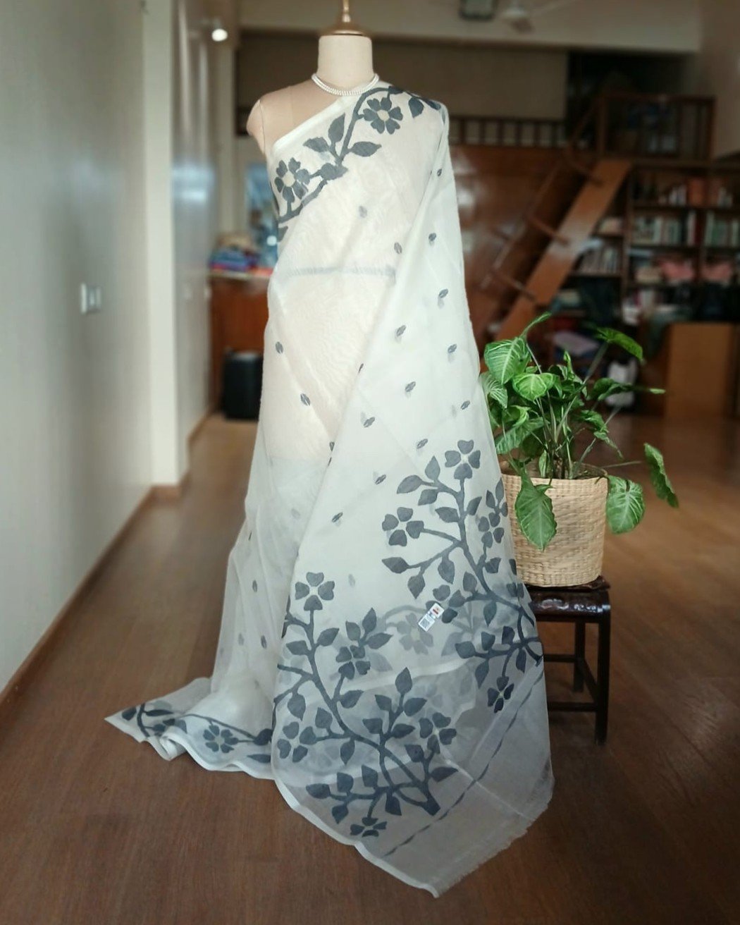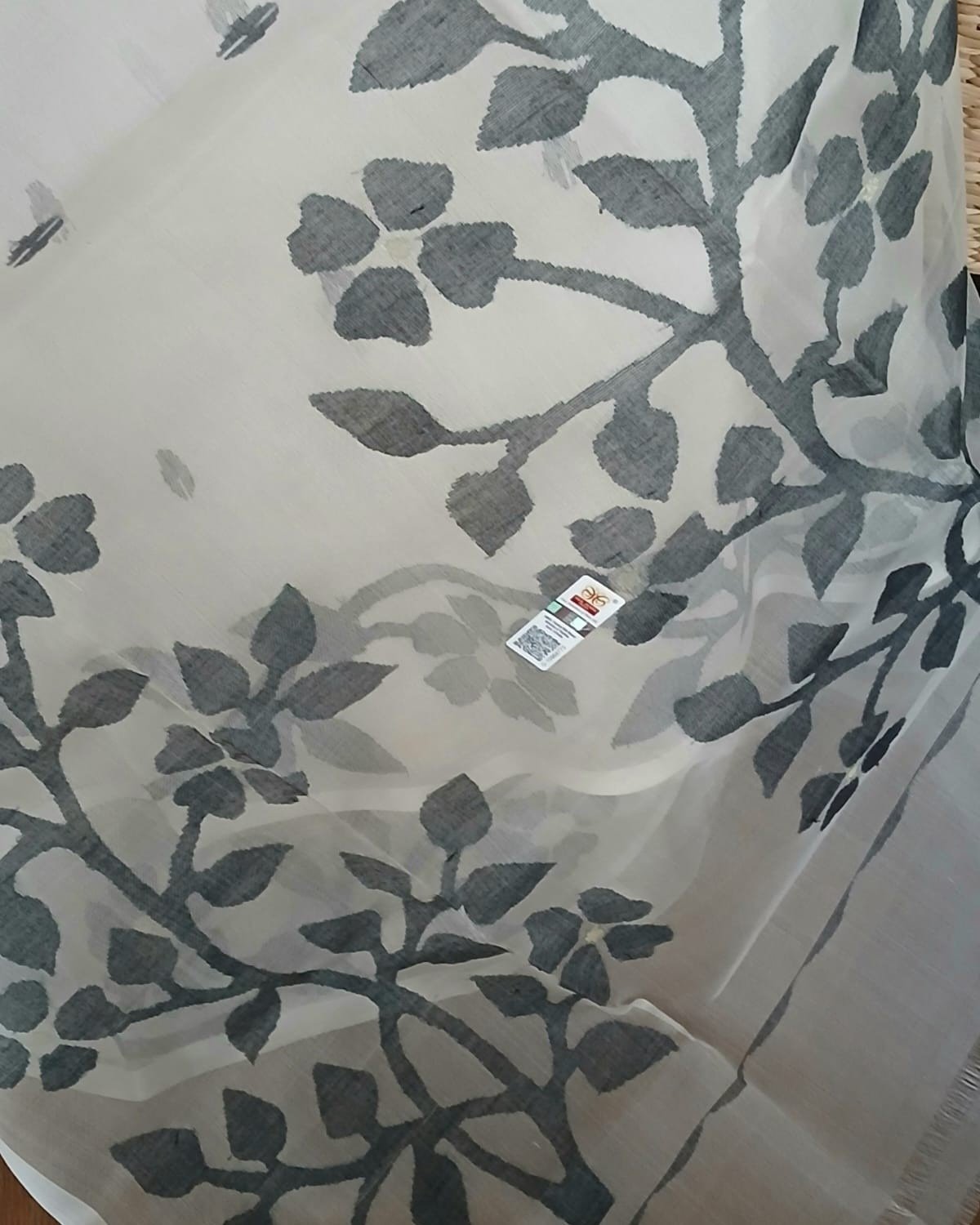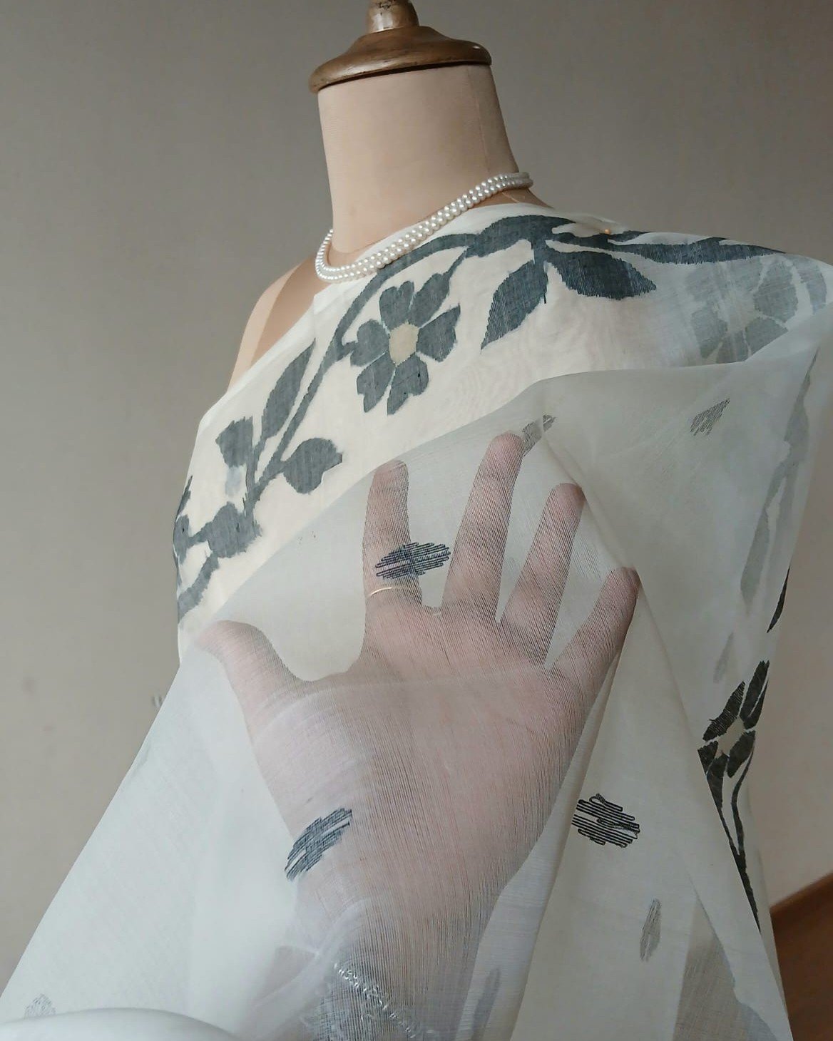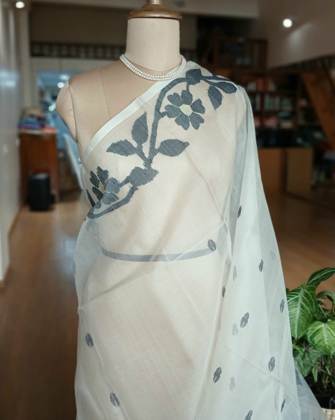Hand jamdani from Phulia using the skilled needle jamdani technique. The weavers came from Tangail in Bangladesh during partition of India and also during the 1971 war.