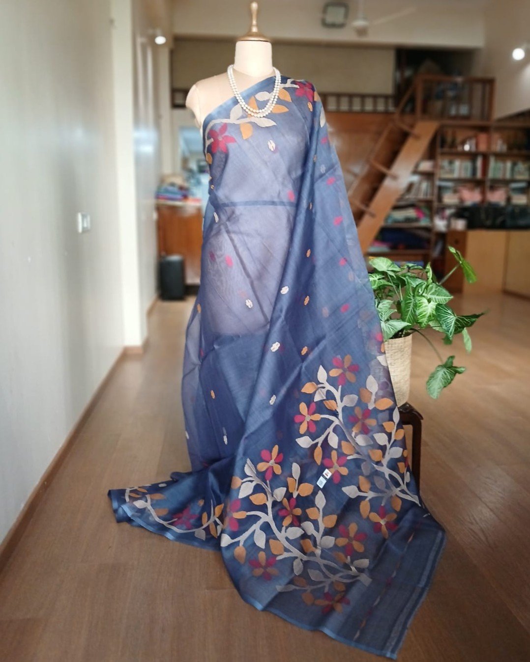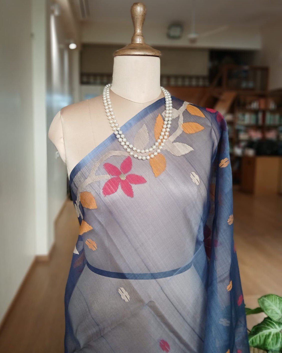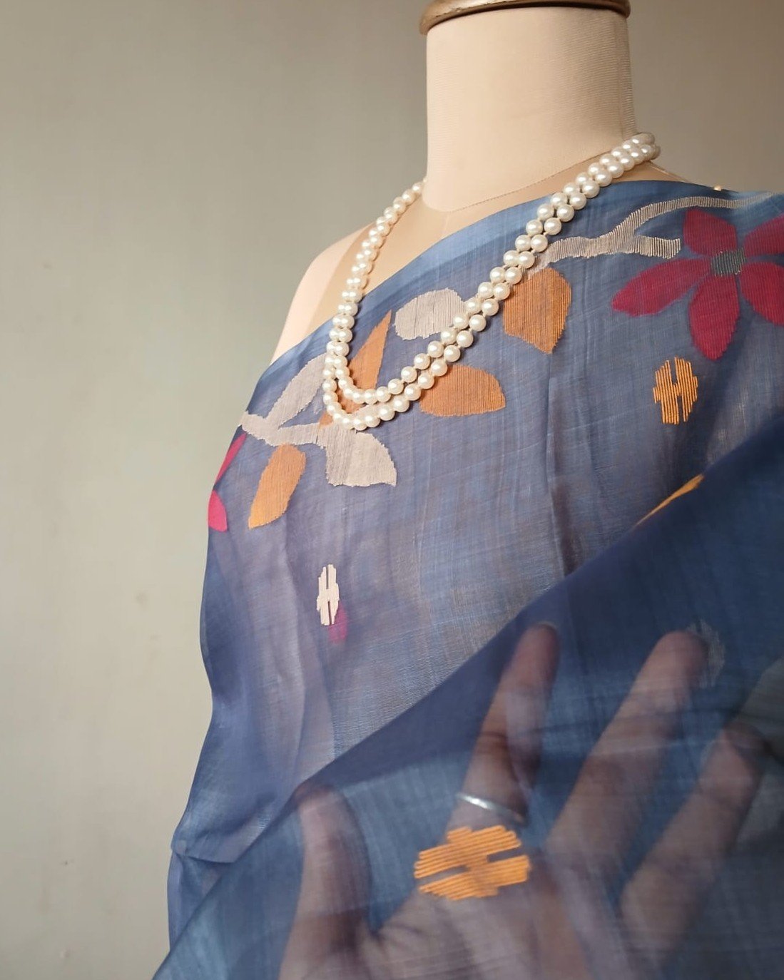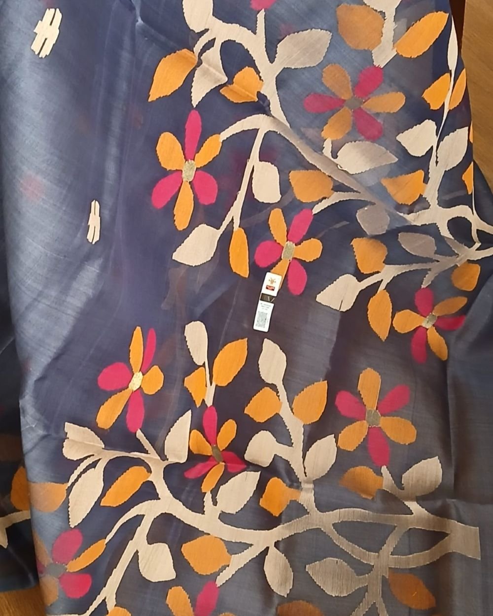 Hand jamdani from Phulia using the skilled needle jamdani technique. The weavers came from Tangail in Bangladesh during partition of India and also during the 1971 war.