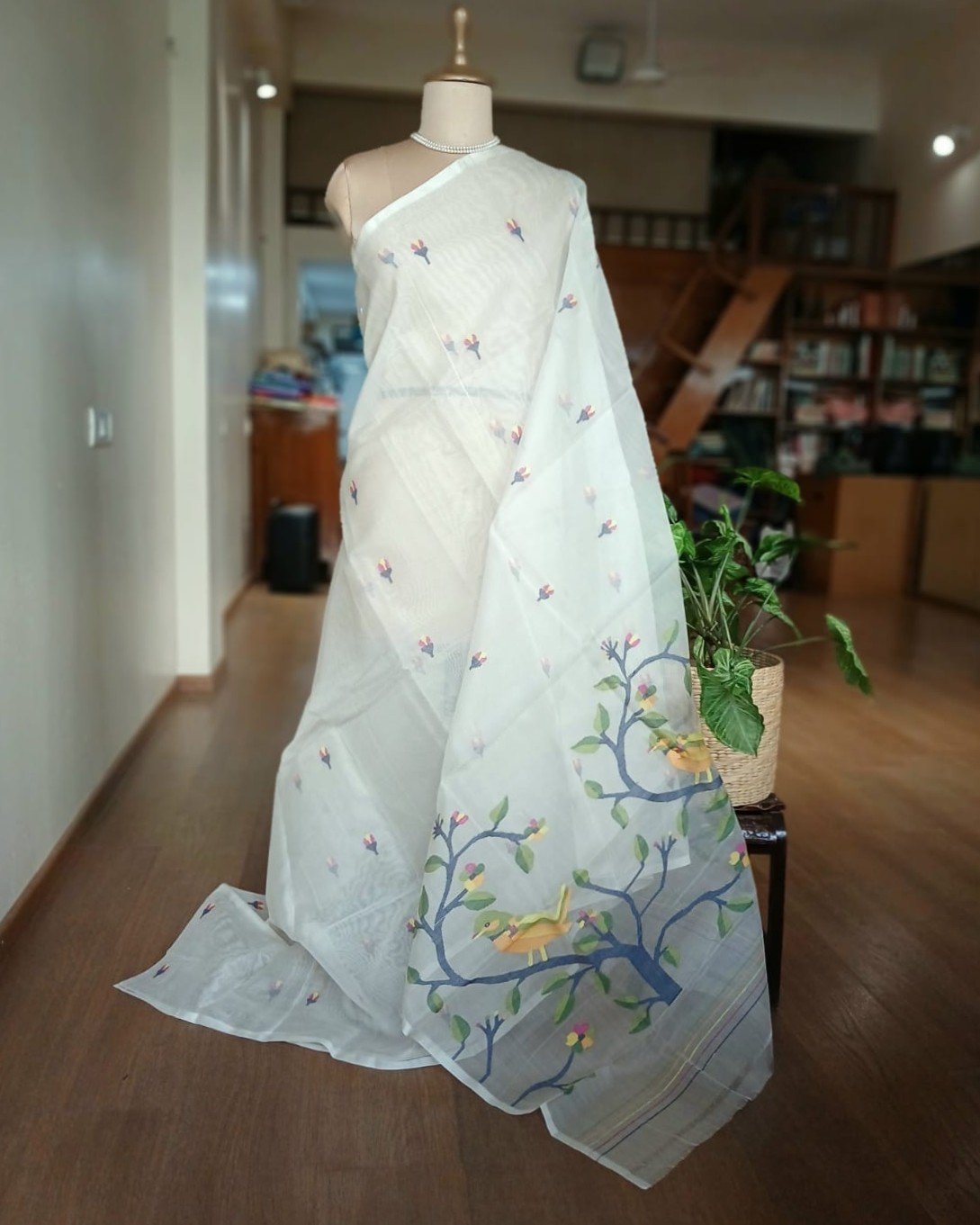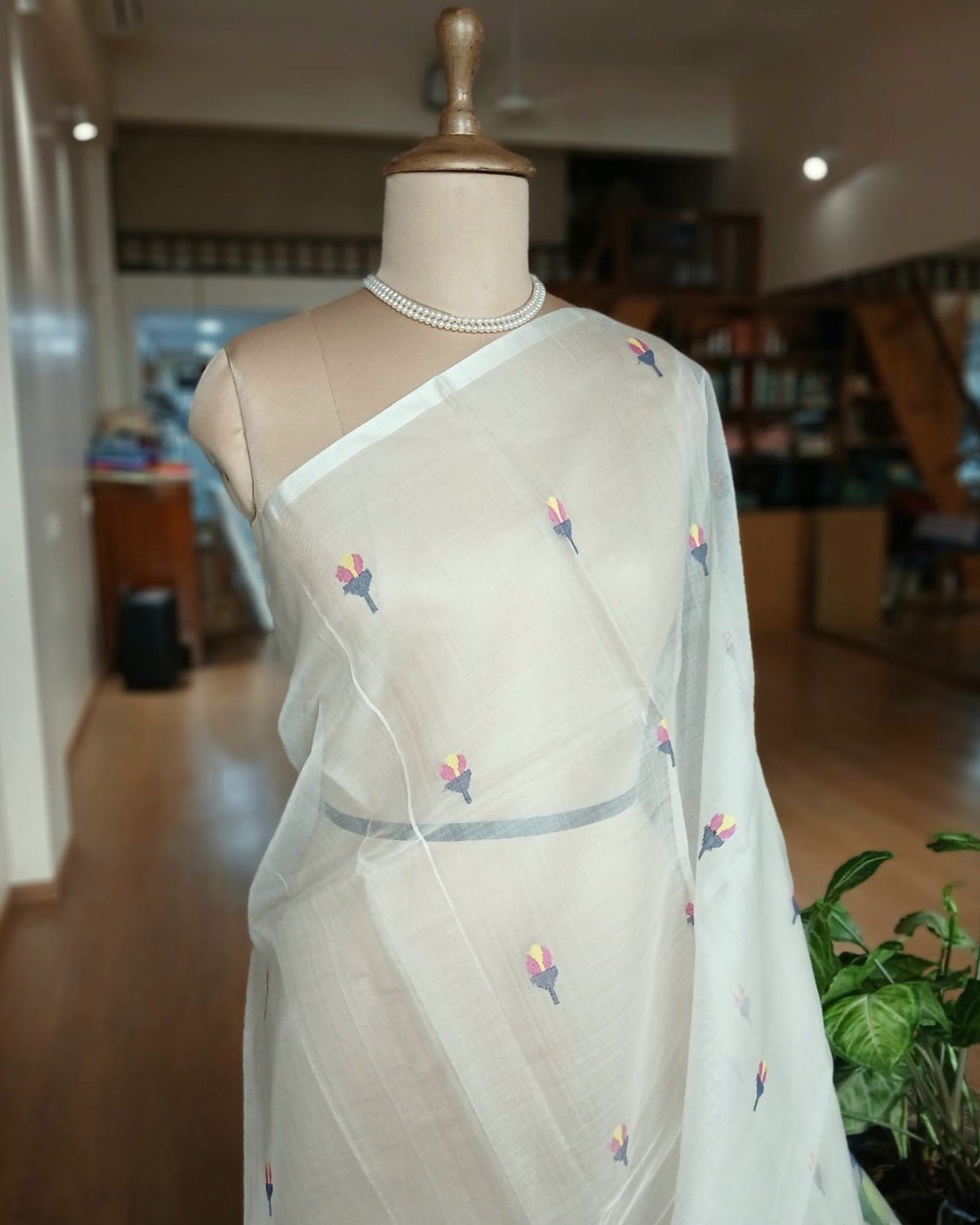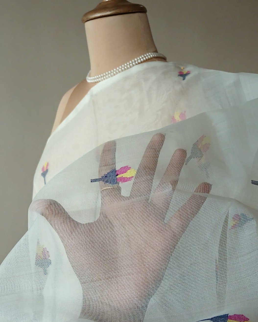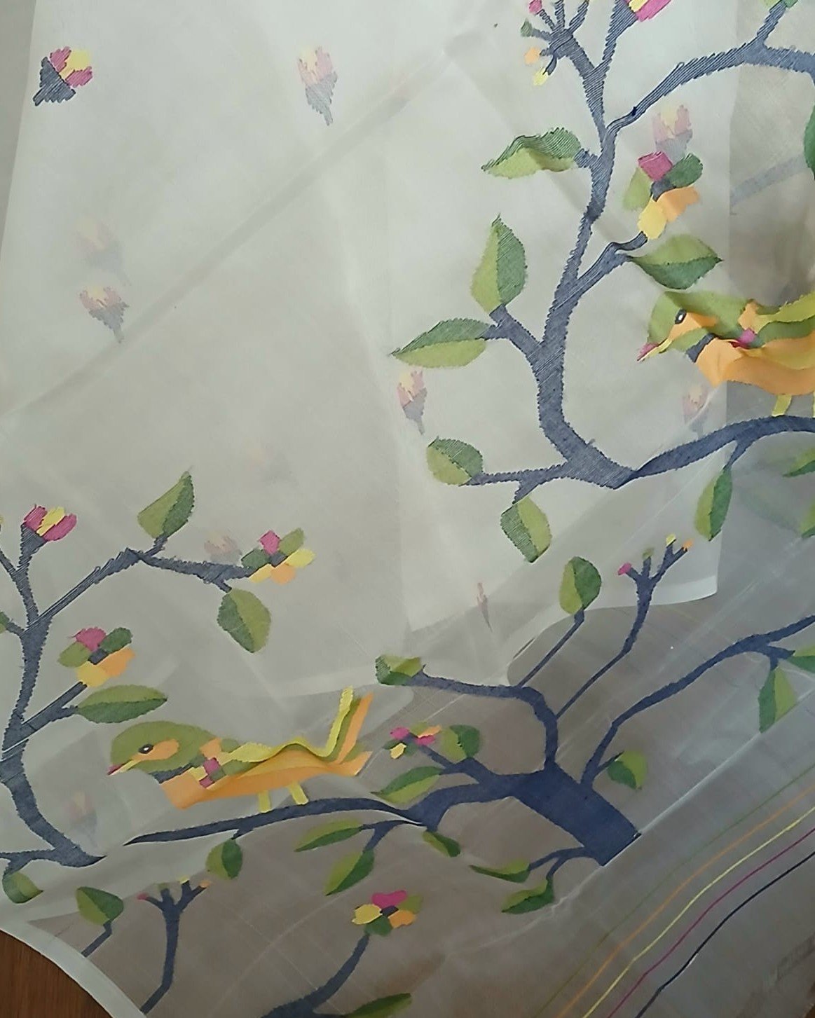 Hand jamdani from Phulia using the skilled needle jamdani technique. The weavers came from Tangail in Bangladesh during partition of India and also during the 1971 war.
