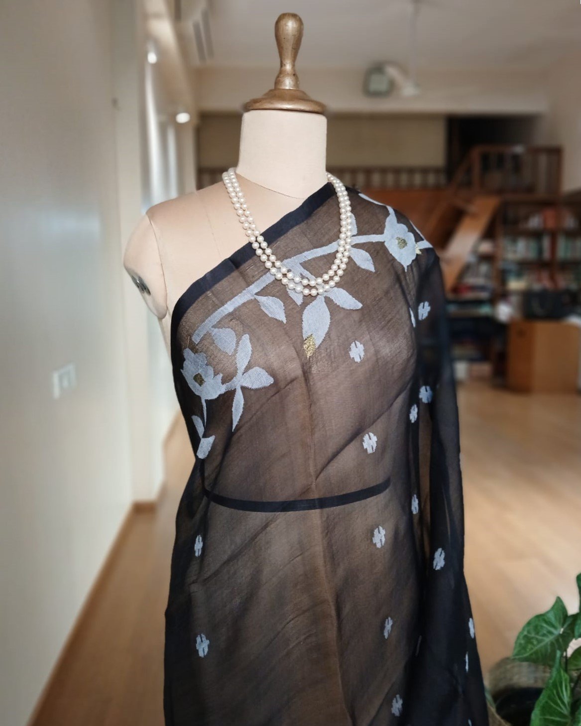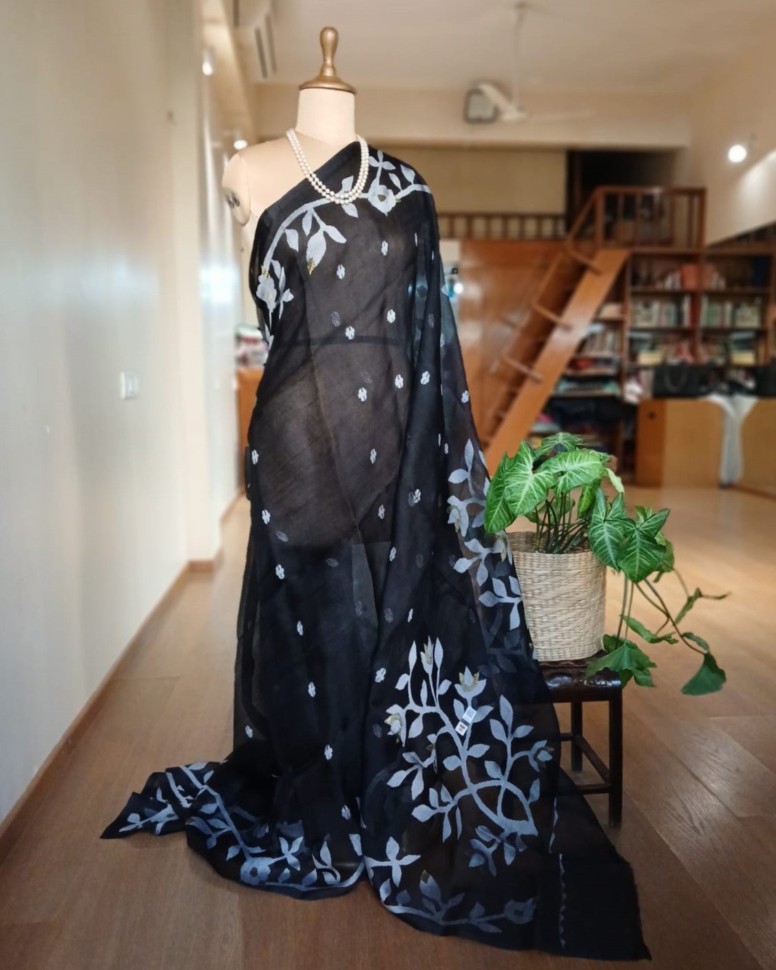 Hand jamdani from Phulia using the skilled needle jamdani technique. The weavers came from Tangail in Bangladesh during partition of India and also during the 1971 war.