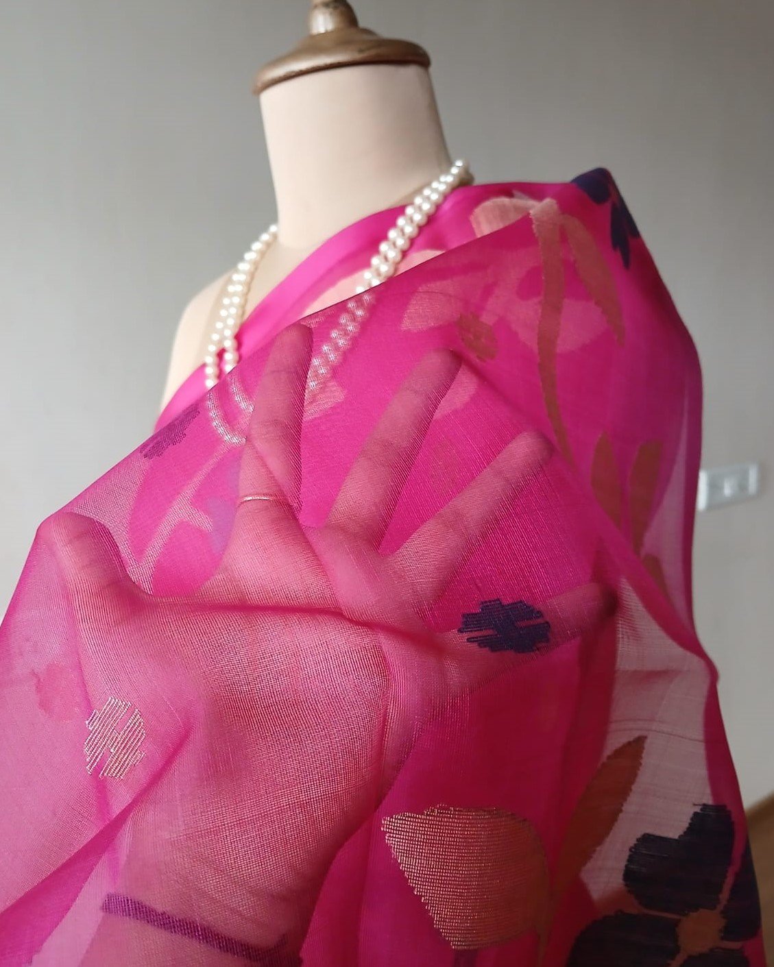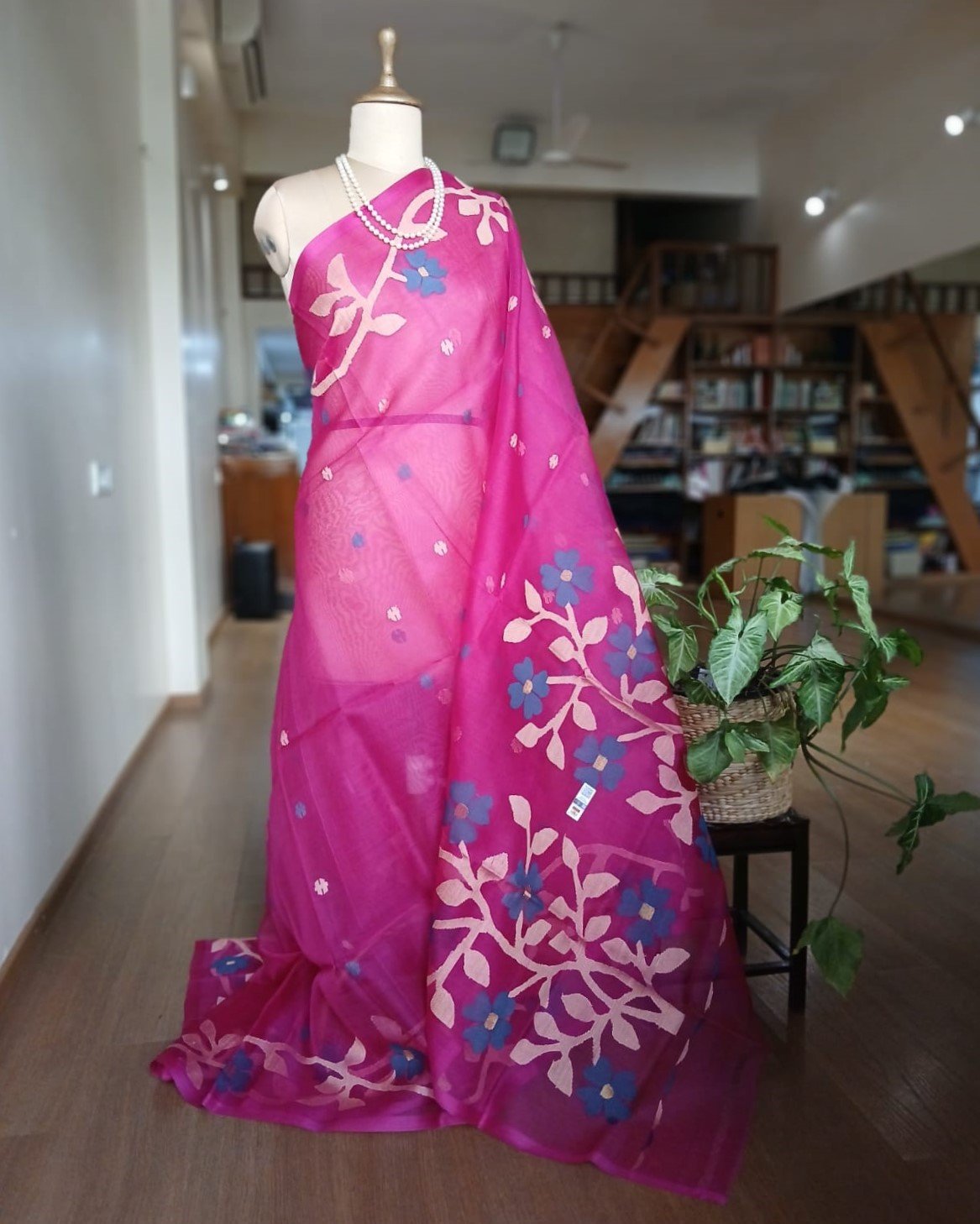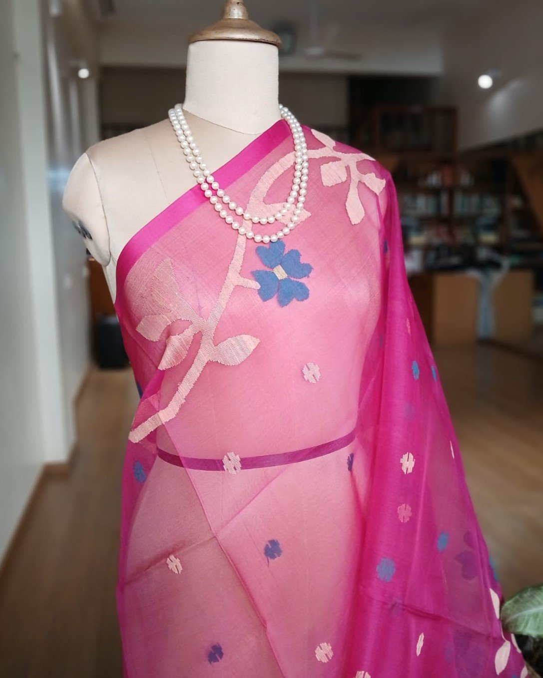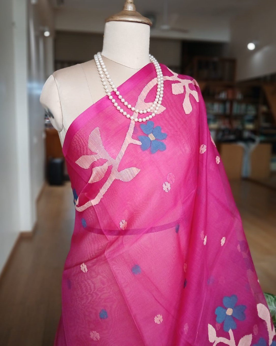 Hand jamdani from Phulia using the skilled needle jamdani technique. The weavers came from Tangail in Bangladesh during partition of India and also during the 1971 war.