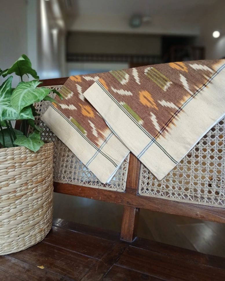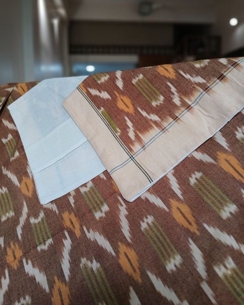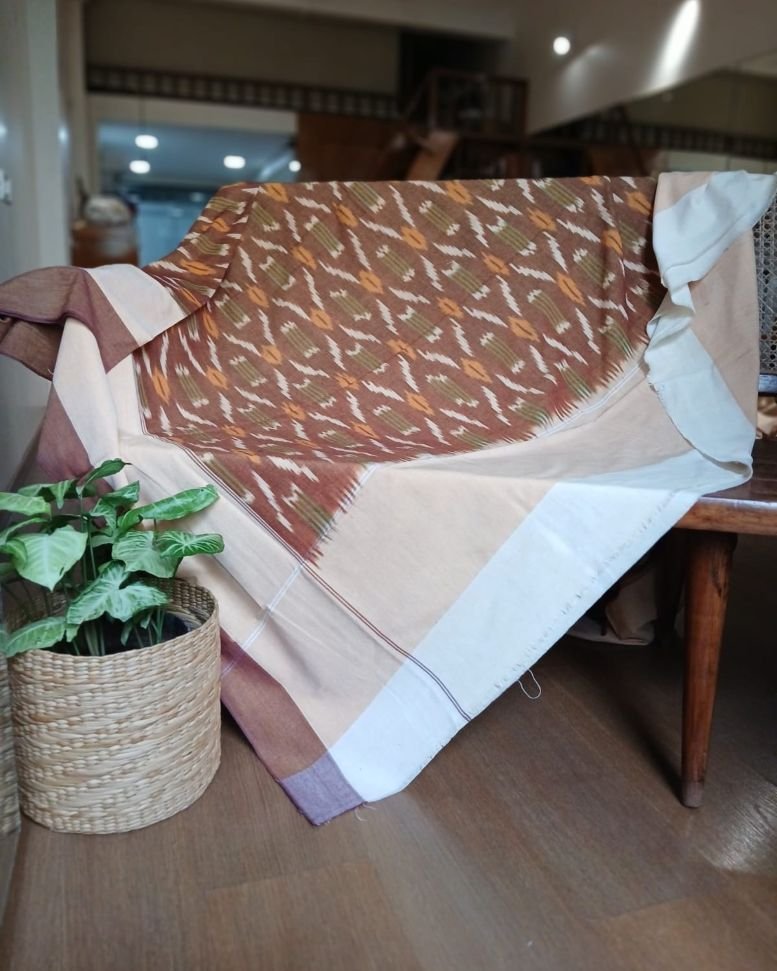 Hand tied and dyed Ikat cotton yarns woven on handloom. It’s a sturdy comfortable sheet. Can be machine washed.