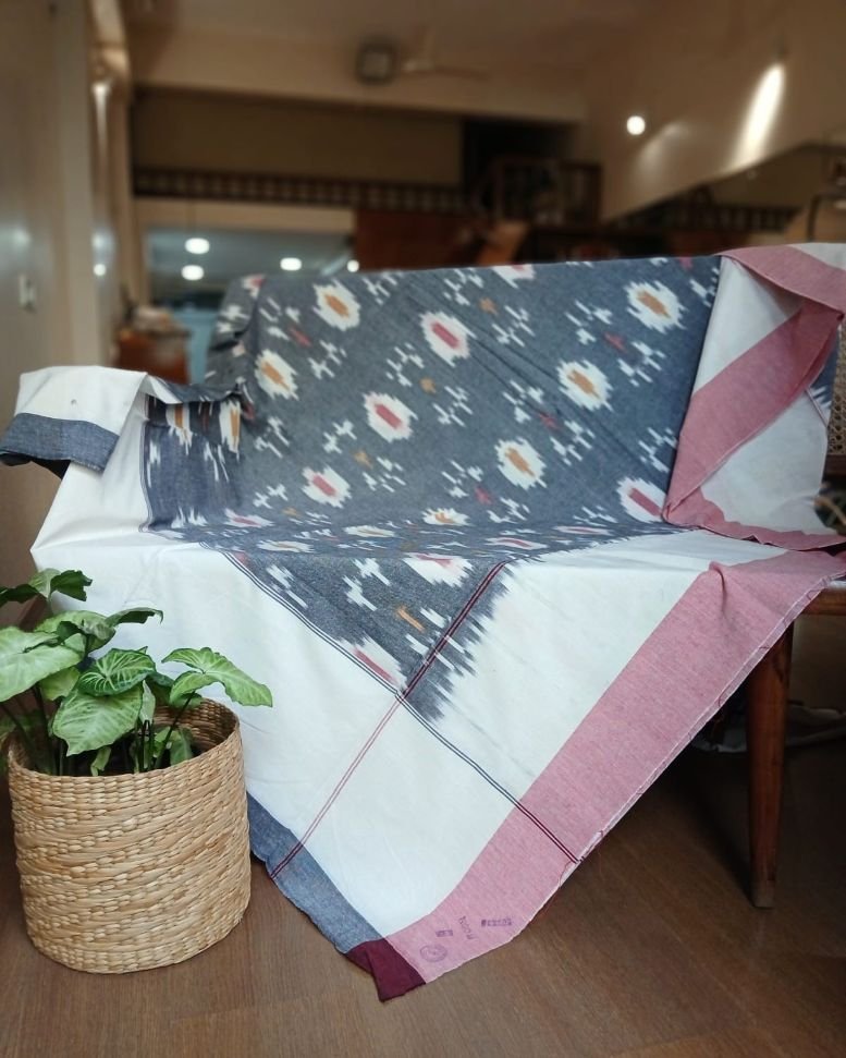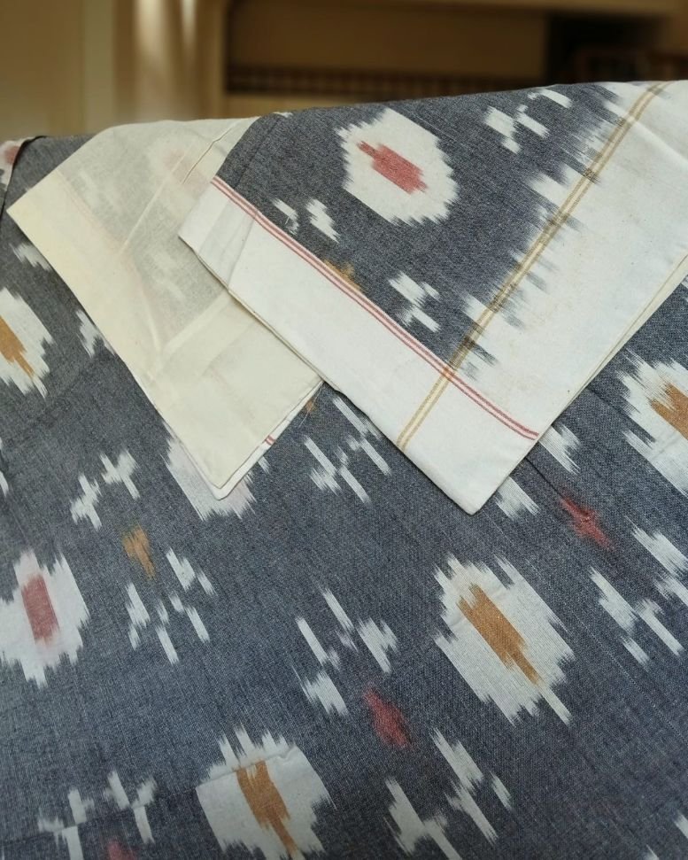 King Size 108 x 108 inches Double Bedsheet Set with 2 matching pillowcases from Telangana. Hand tied and dyed Ikat cotton yarns woven on handloom. It’s a sturdy comfortable sheet. Can be machine washed or handwashed.