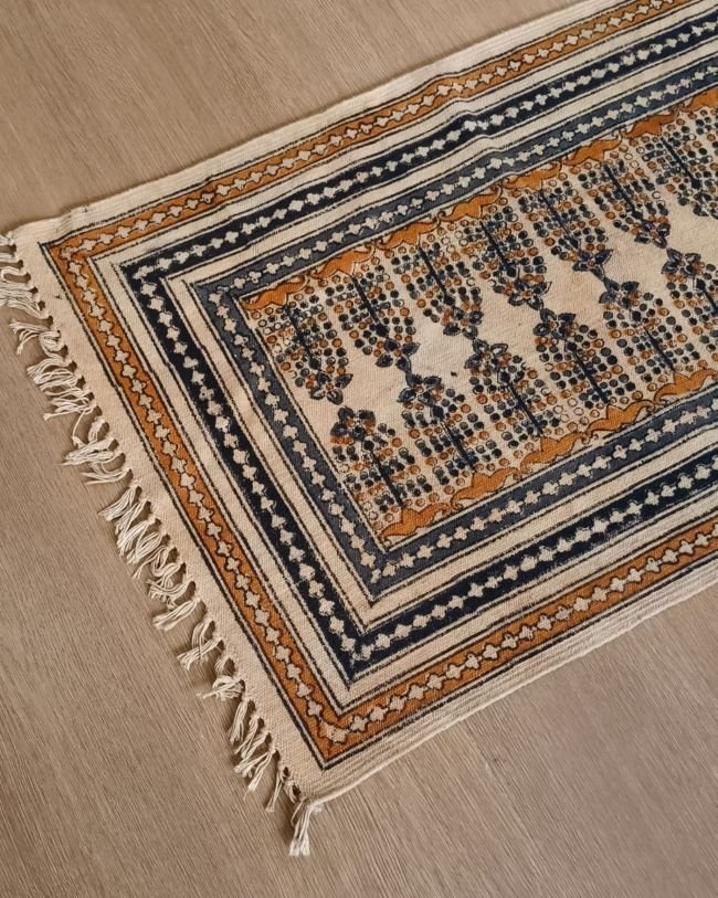 Natural Dyes Warangal Kalamkari Dhurrie, handwoven and handblocked with floral and geometric designs.