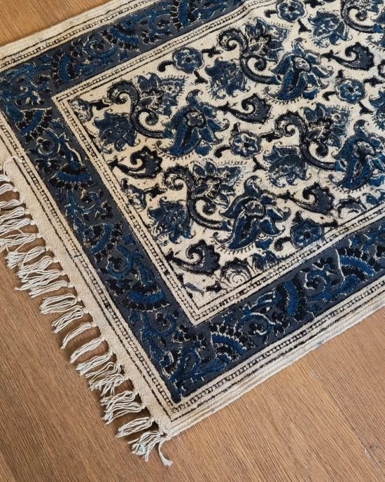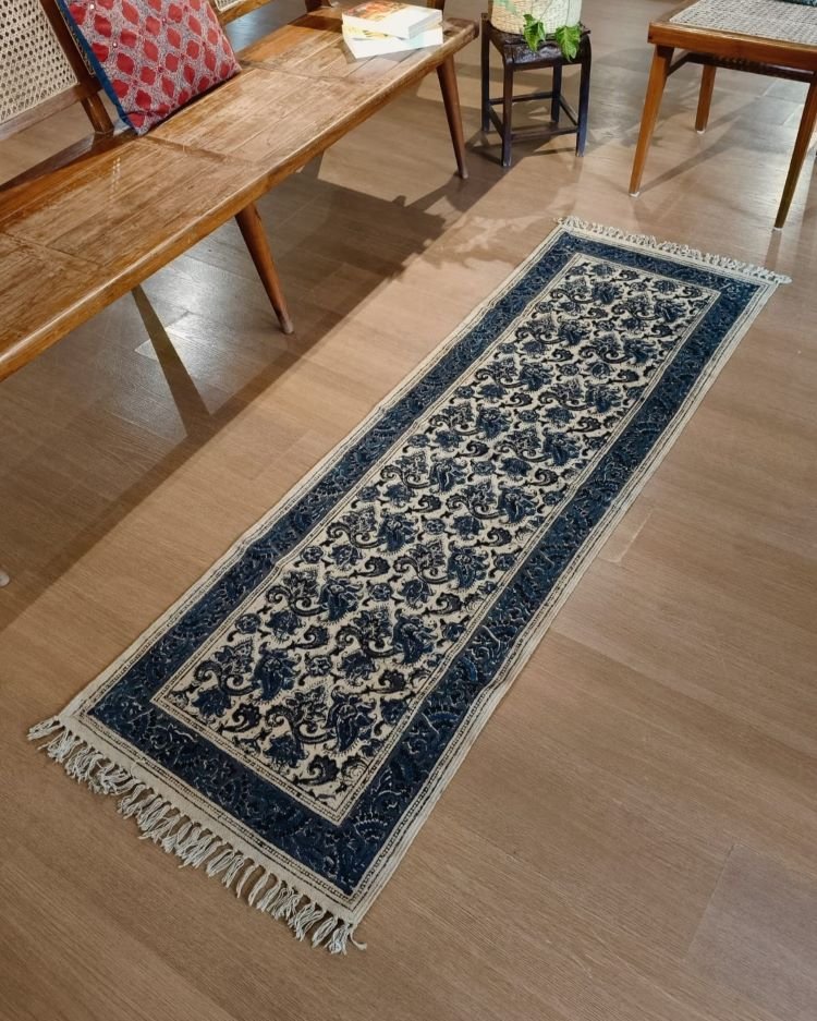 Natural Dyes Warangal Kalamkari Dhurrie, handwoven and handblocked with floral and geometric designs.