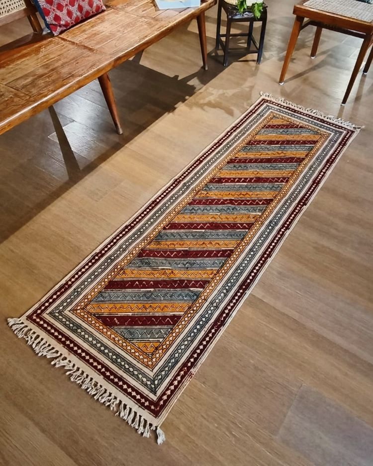 Natural Dyes Warangal Kalamkari Dhurrie, handwoven and handblocked with floral and geometric designs.