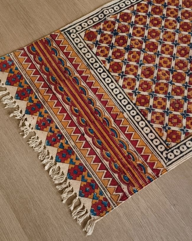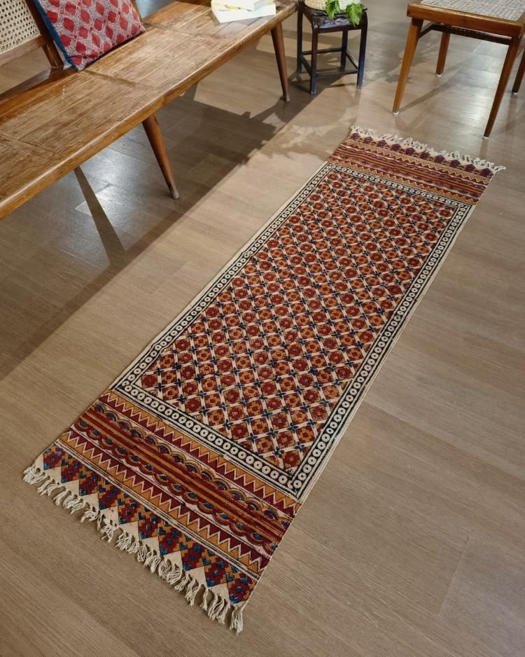 Natural Dyes Warangal Kalamkari Dhurrie, handwoven and handblocked with floral and geometric designs.