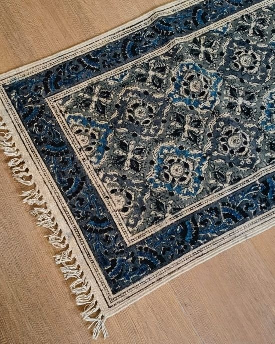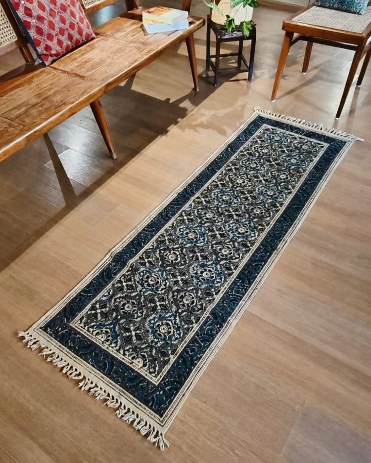 Natural Dyes Warangal Kalamkari Dhurrie, handwoven and handblocked with floral and geometric designs.