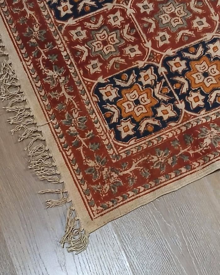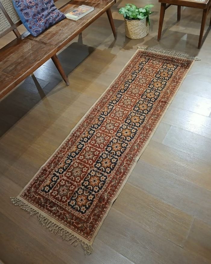 Natural Dyes Warangal Kalamkari Dhurrie, handwoven and handblocked with floral and geometric designs.