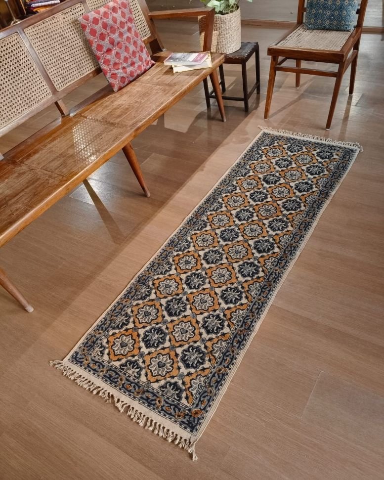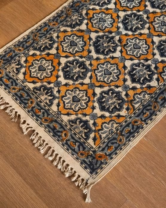 Natural Dyes Warangal Kalamkari Dhurrie, handwoven and handblocked with floral and geometric designs.