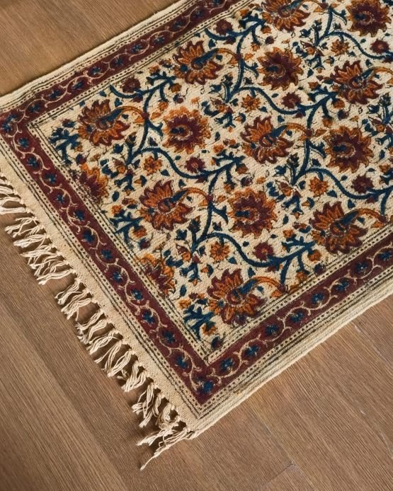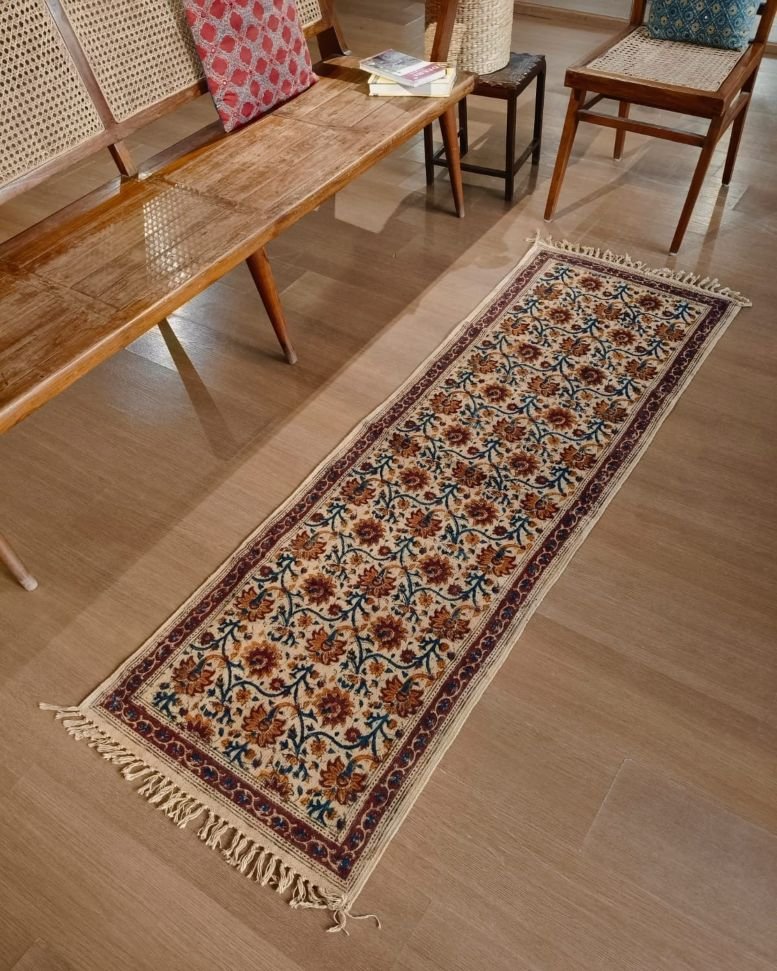 Natural Dyes Warangal Kalamkari Dhurrie, handwoven and handblocked with floral and geometric designs.