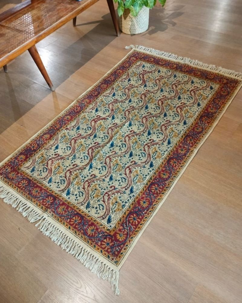 Natural Dyes Warangal Kalamkari Dhurrie, handwoven and handblocked with floral designs.