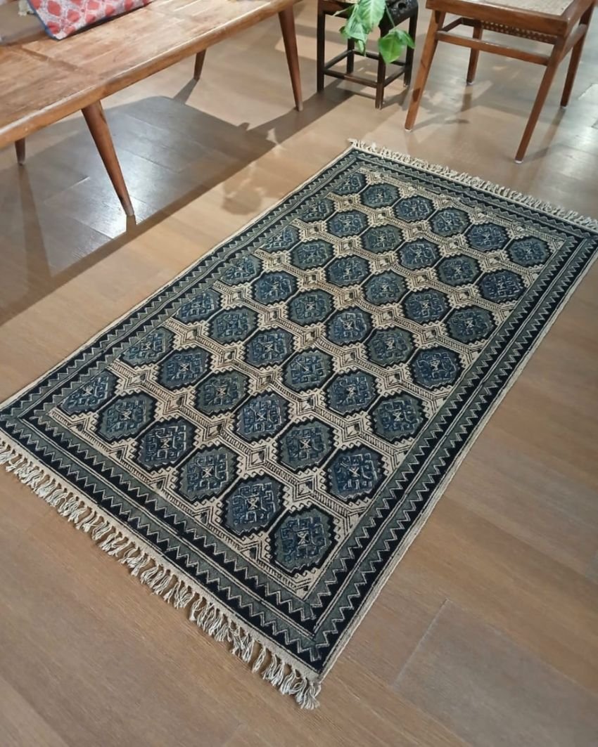 Natural Dyes Warangal Kalamkari Dhurrie, handwoven and handblocked with floral designs.