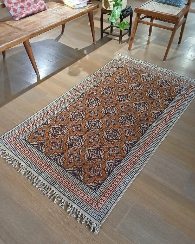 Natural Dyes Warangal Kalamkari Dhurrie, handwoven and handblocked with floral designs.
