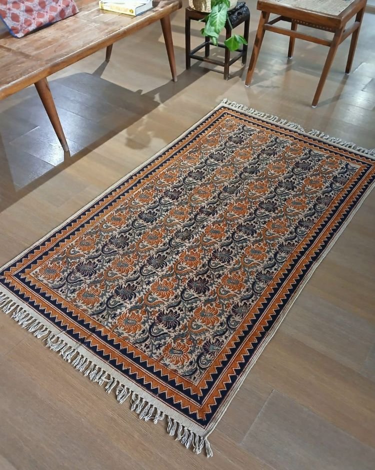 Natural Dyes Warangal Kalamkari Dhurrie, handwoven and handblocked with floral designs.
