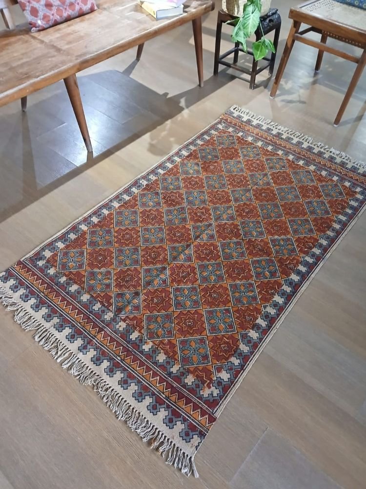Natural Dyes Warangal Kalamkari Dhurrie, handwoven and handblocked with floral designs.