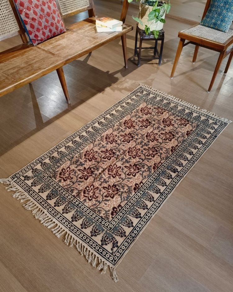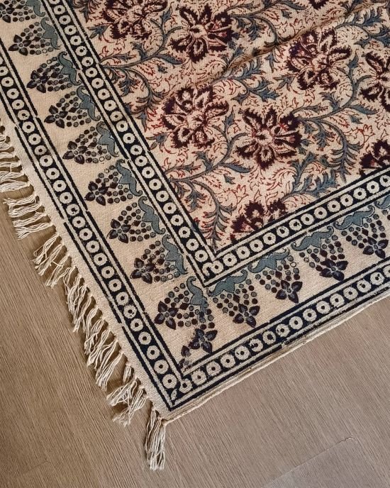 Natural Dyes Warangal Kalamkari Dhurrie, handwoven and handblocked with floral designs.