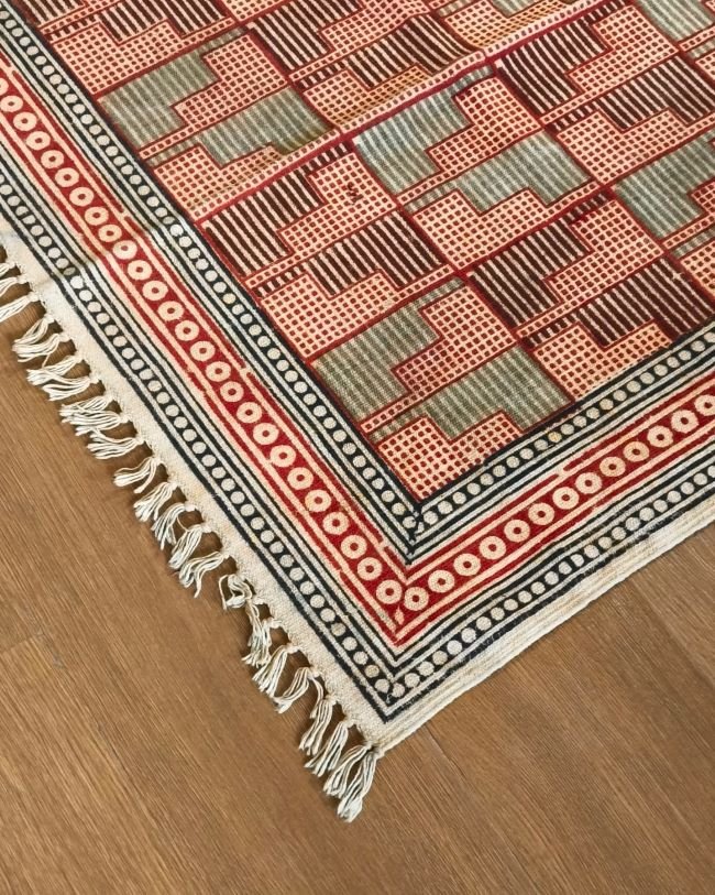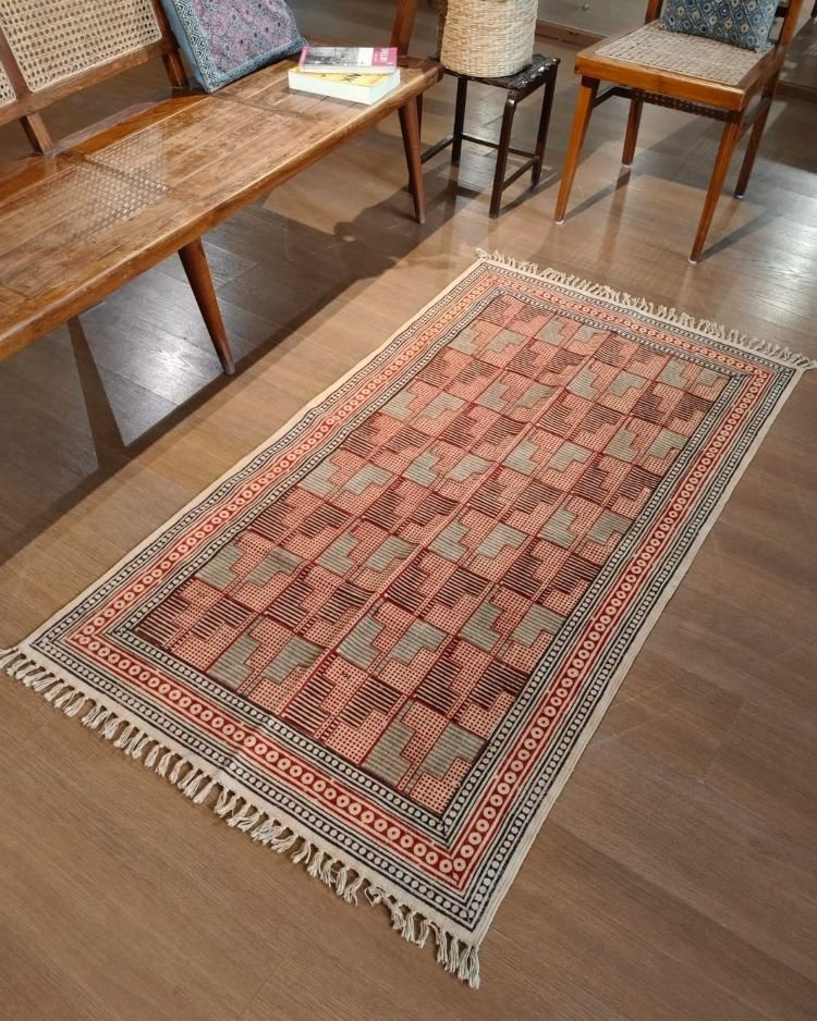 Natural Dyes Warangal Kalamkari Dhurrie, handwoven and handblocked with floral designs.
