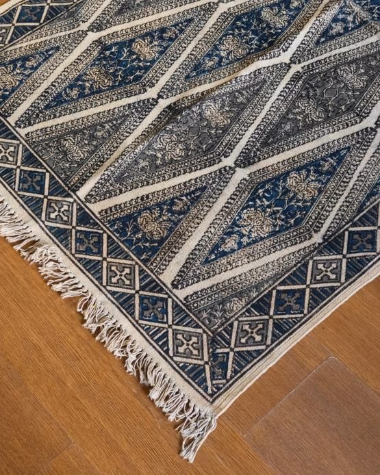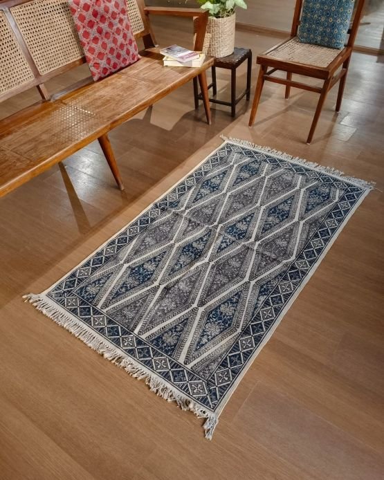 Natural Dyes Warangal Kalamkari Dhurrie, handwoven and handblocked with floral designs.