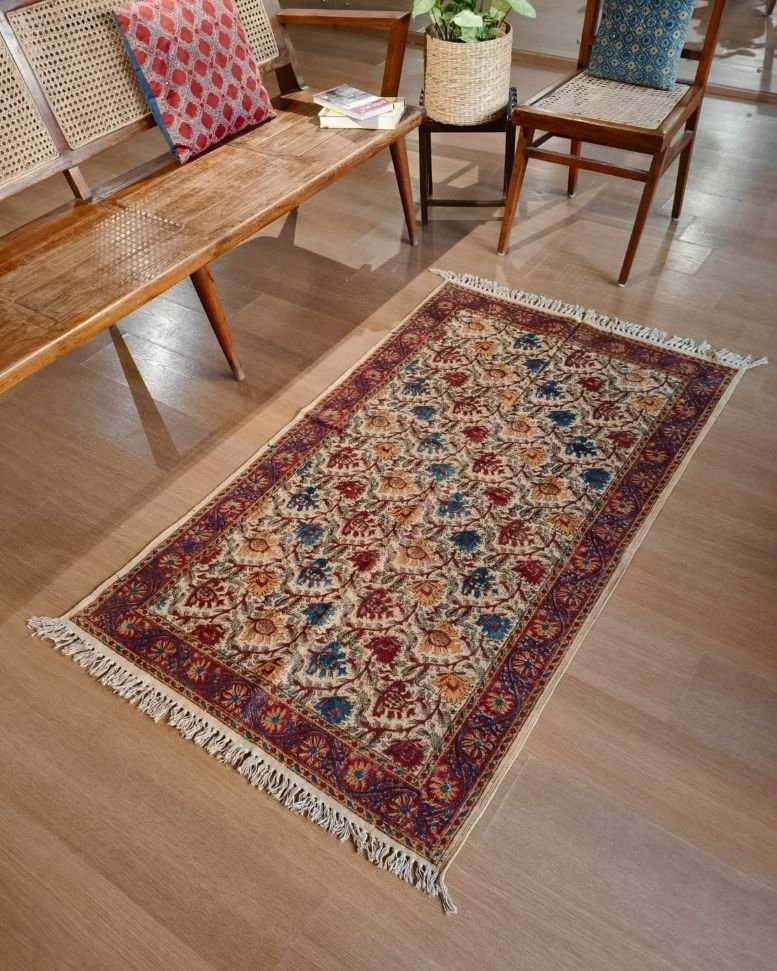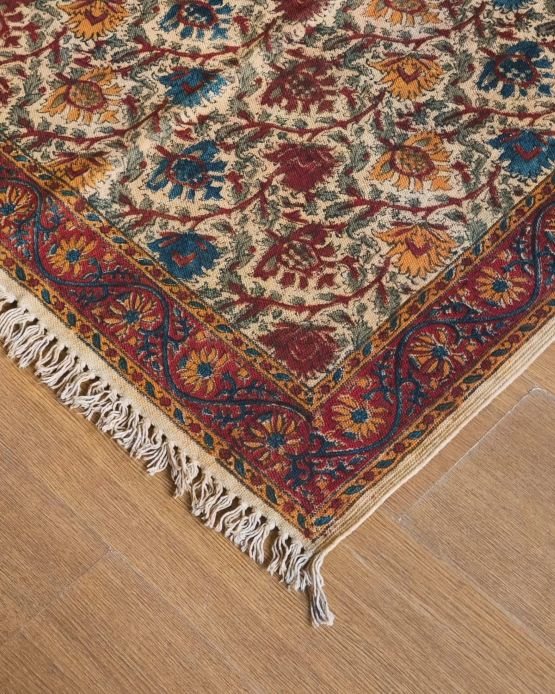 Natural Dyes Warangal Kalamkari Dhurrie, handwoven and handblocked with floral designs.