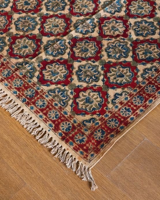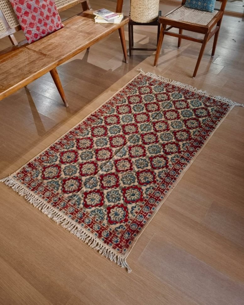 Natural Dyes Warangal Kalamkari Dhurrie, handwoven and handblocked with floral designs.