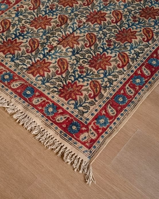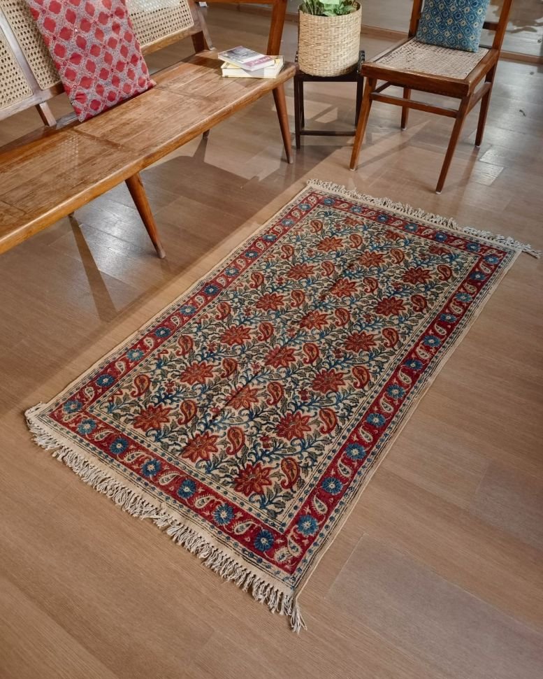 Natural Dyes Warangal Kalamkari Dhurrie, handwoven and handblocked with floral designs.