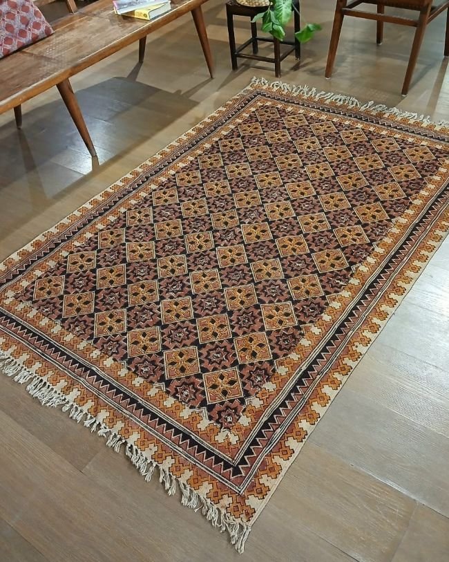 Natural Dyes Warangal Kalamkari Dhurrie, handwoven and handblocked with floral and geometric designs.