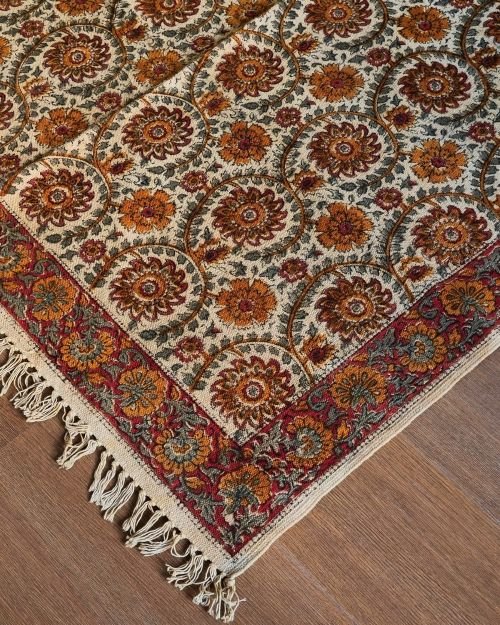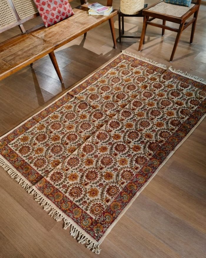 Natural Dyes Warangal Kalamkari Dhurrie, handwoven and handblocked with floral and geometric designs.