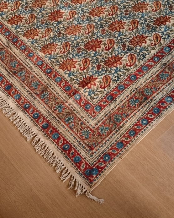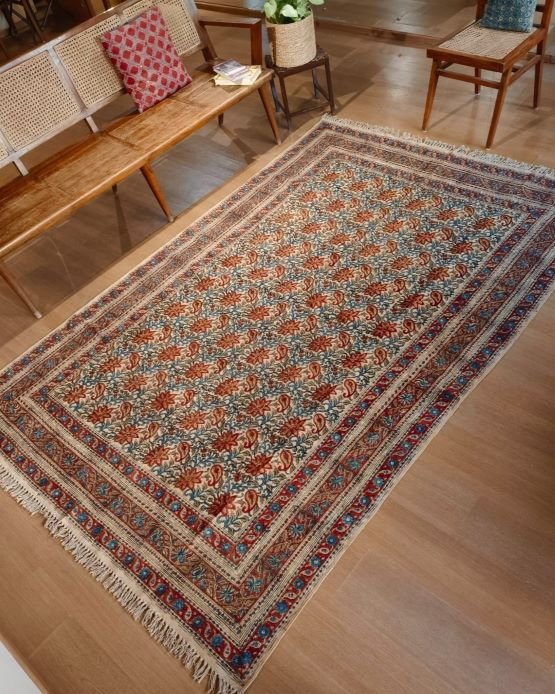Natural Dyes Warangal Kalamkari Dhurrie, handwoven and handblocked with floral and geometric designs.