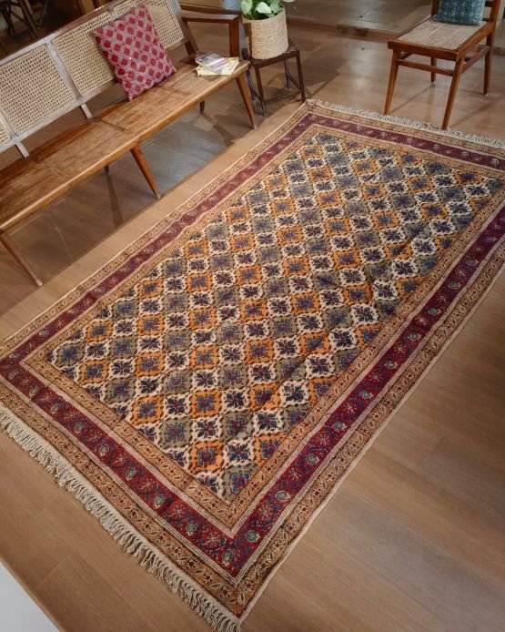 Natural Dyes Warangal Kalamkari Dhurrie, handwoven and handblocked with floral and geometric designs.