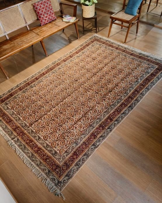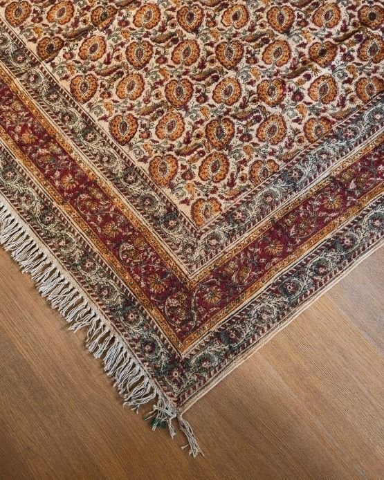 Natural Dyes Warangal Kalamkari Dhurrie, handwoven and handblocked with floral and geometric designs.