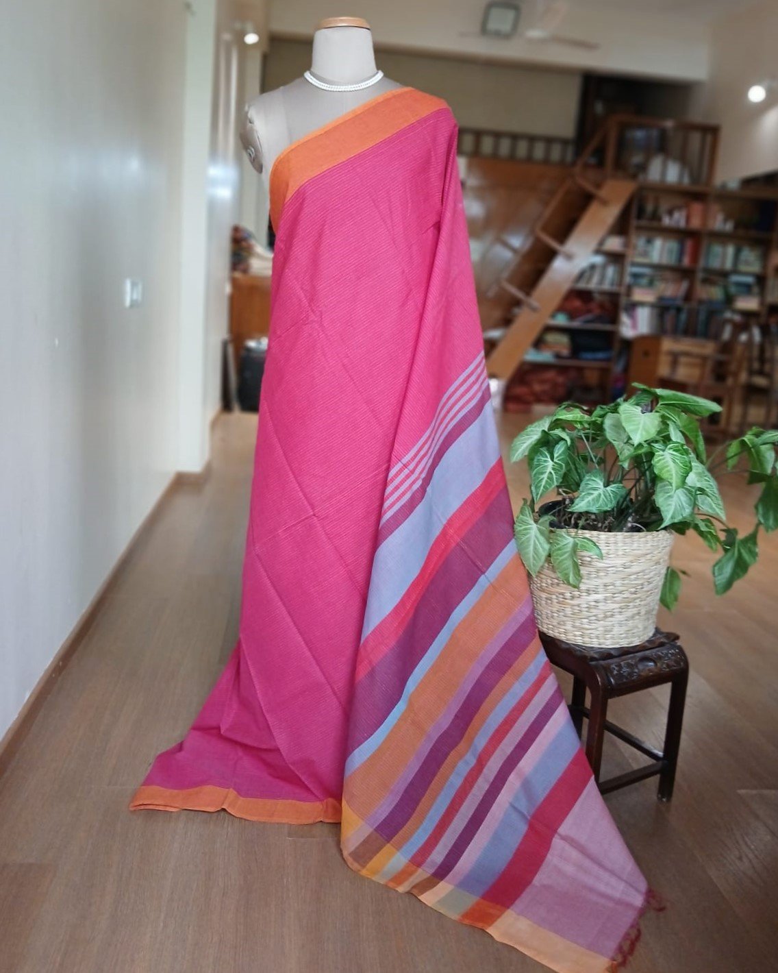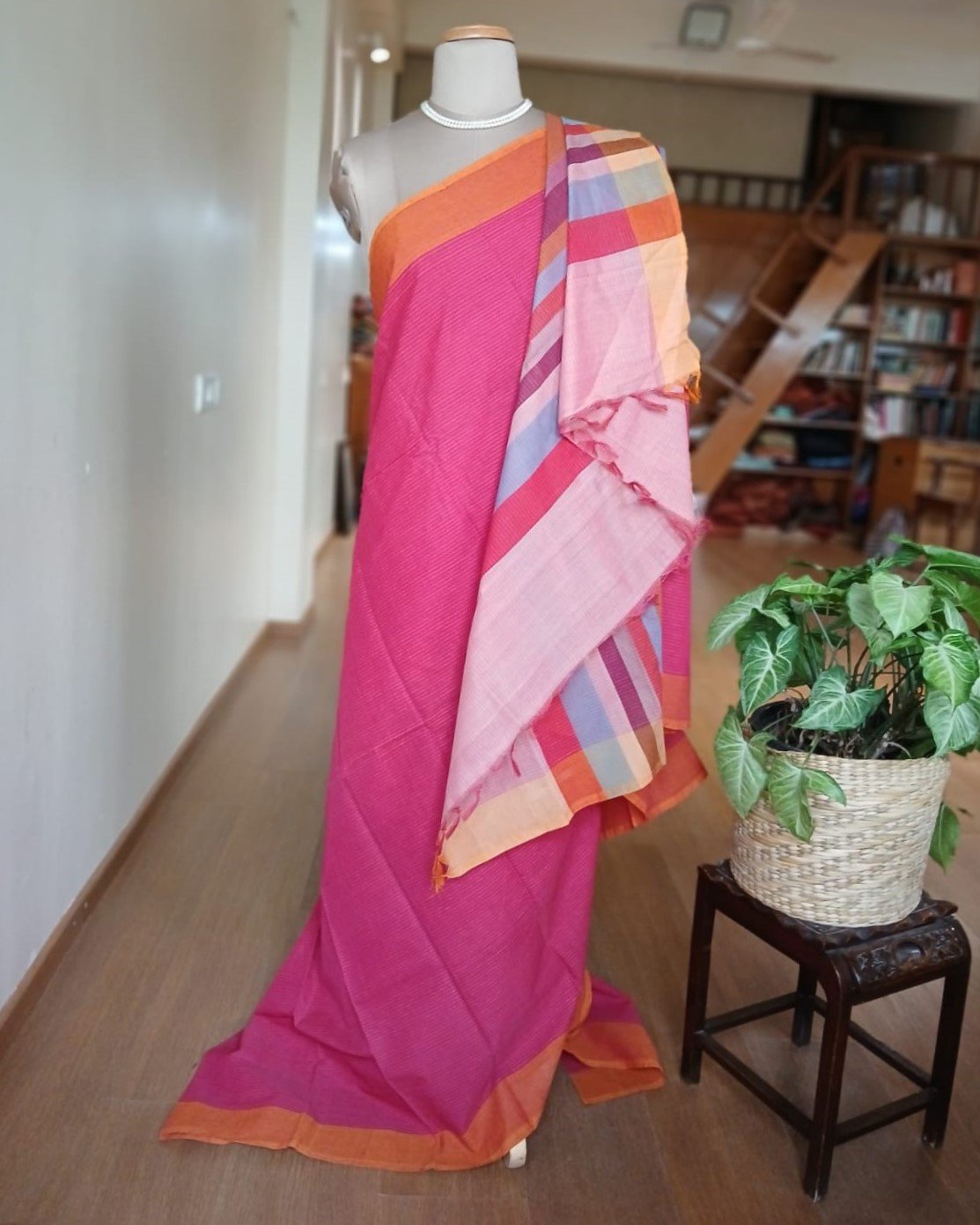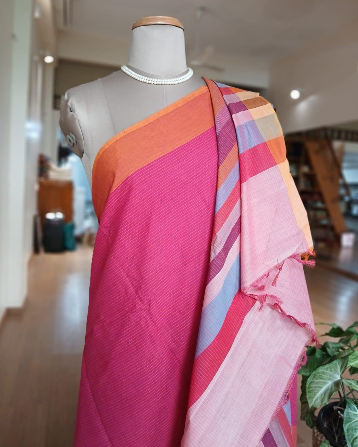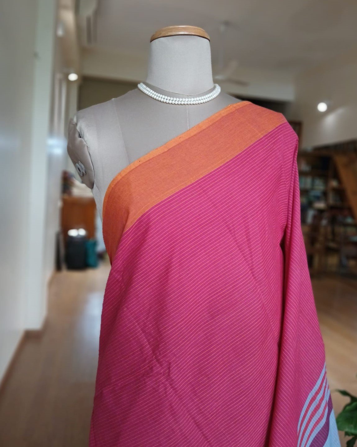 Kanchi cotton handweave saree – Pink and Orange with Banded Palla