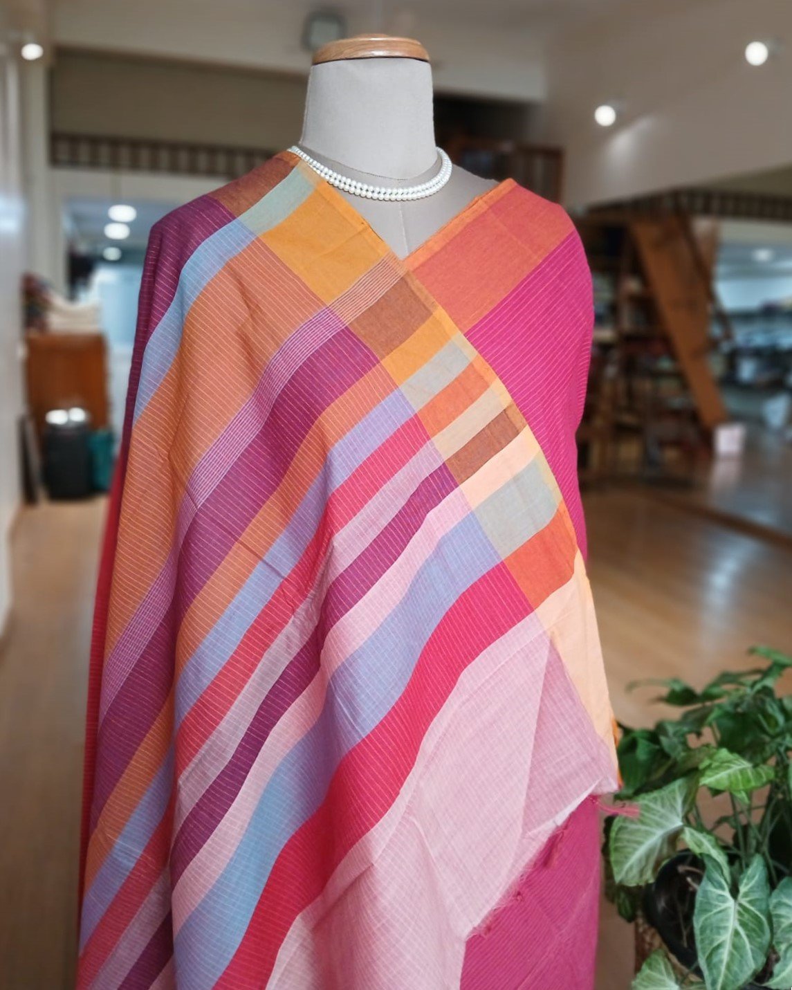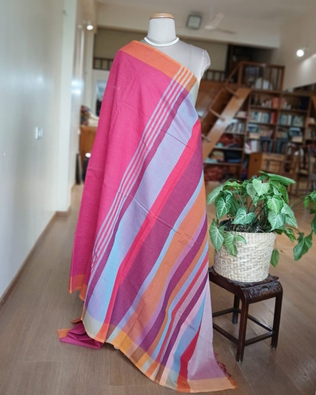A somewhat unusual Kanchi cotton handweave in small stripes, with a contrast border and multi-coloured banded palla design