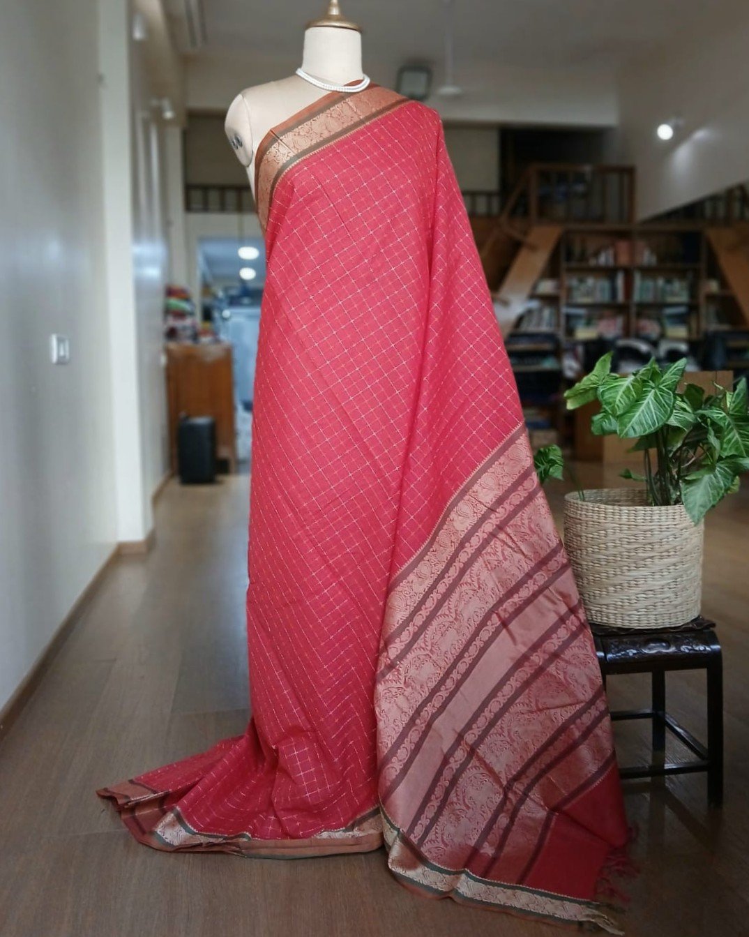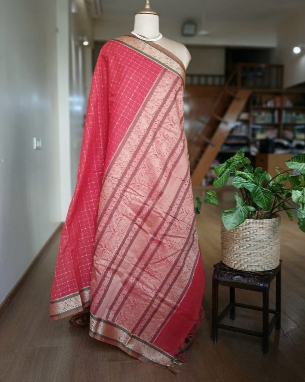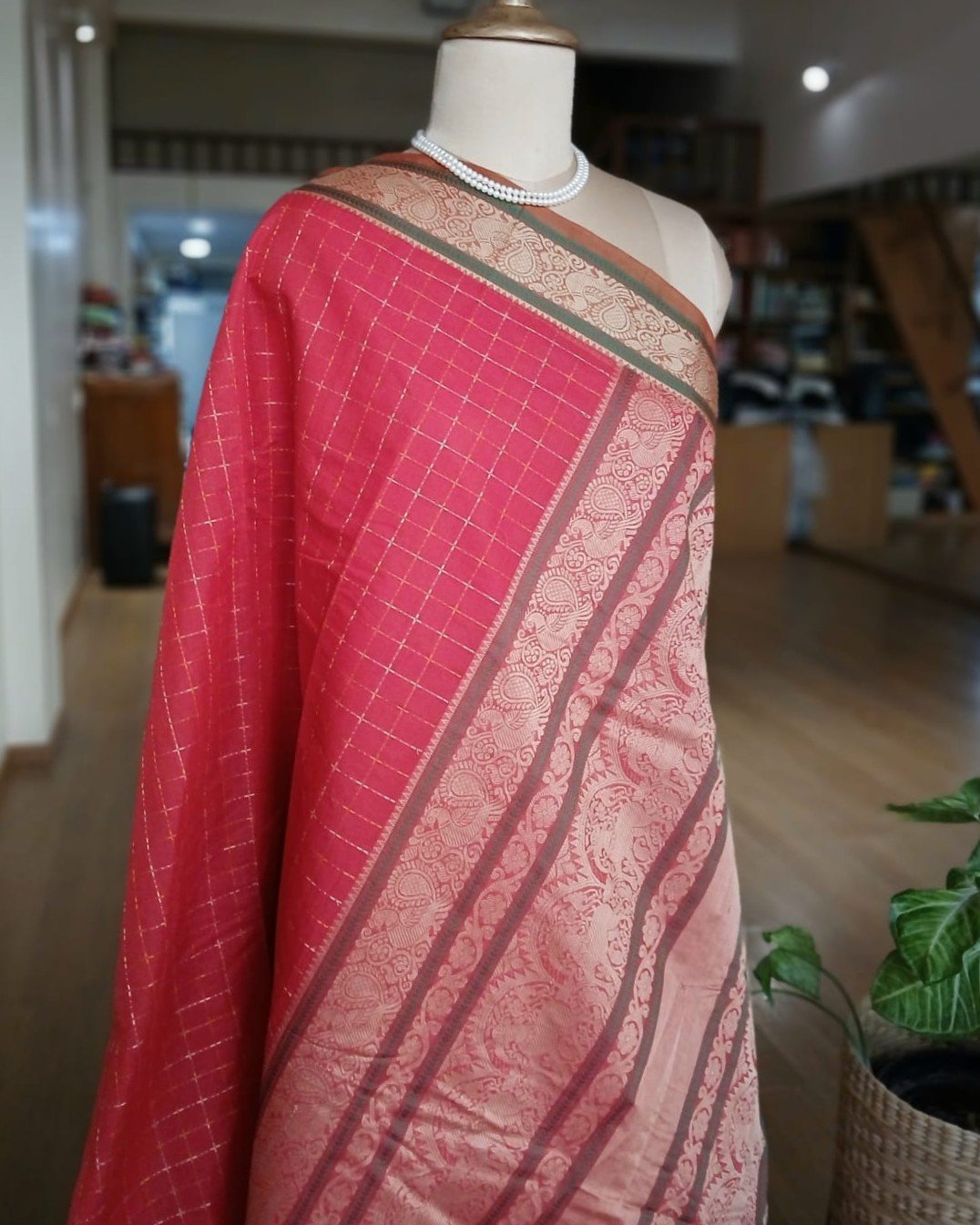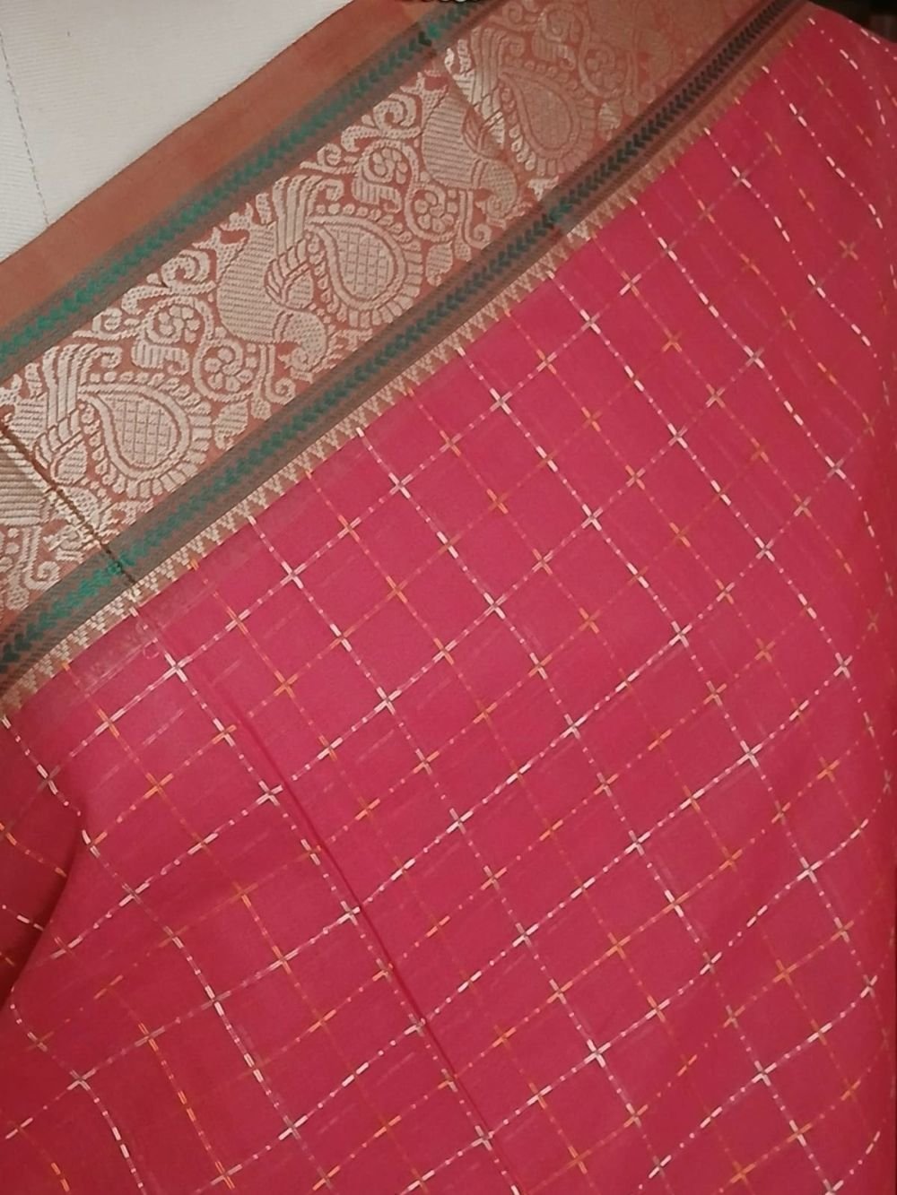 The saree has richly woven borders with mayil motifs in a circular design. The pallu has mayil and kudirai design. There are checks in the body.