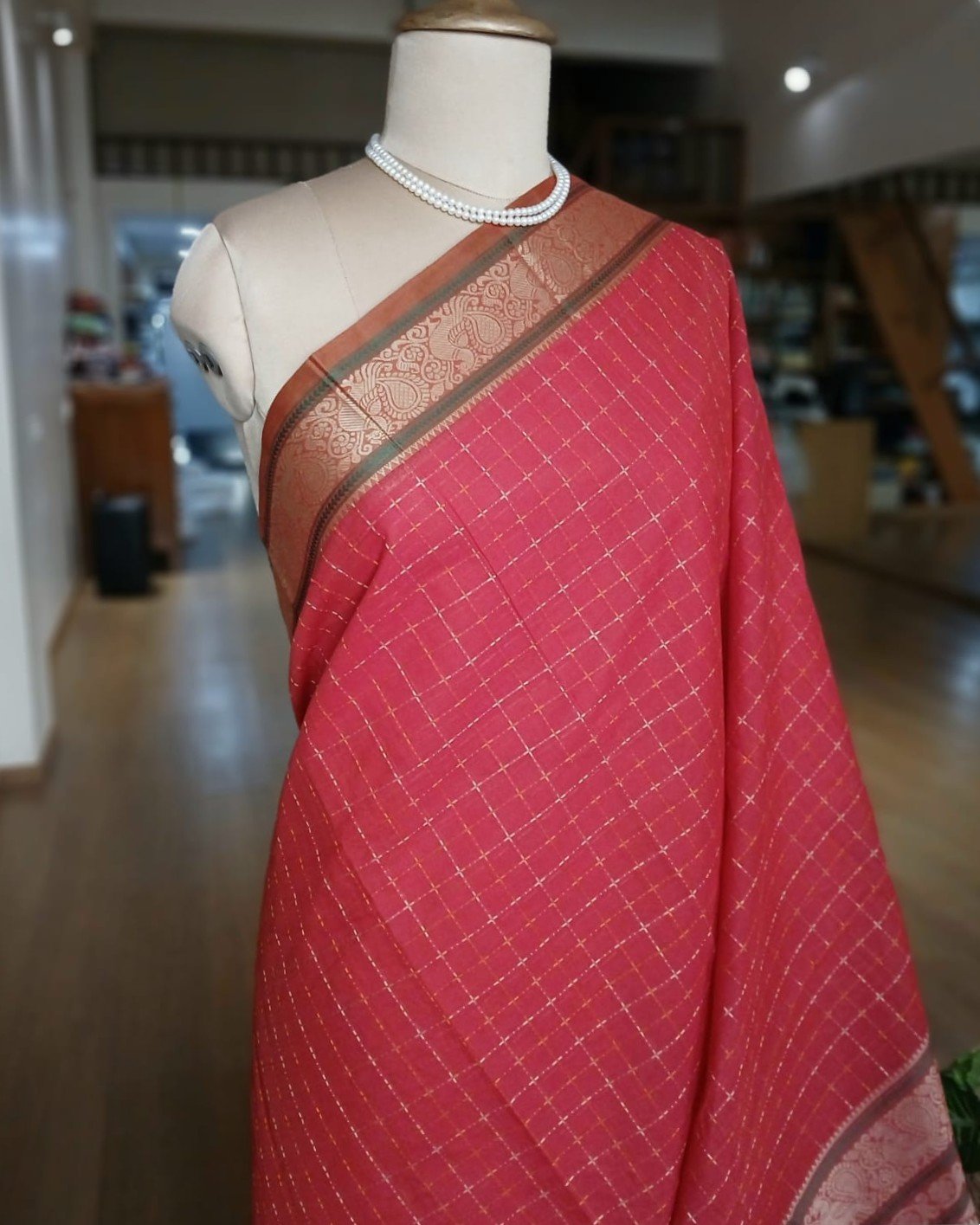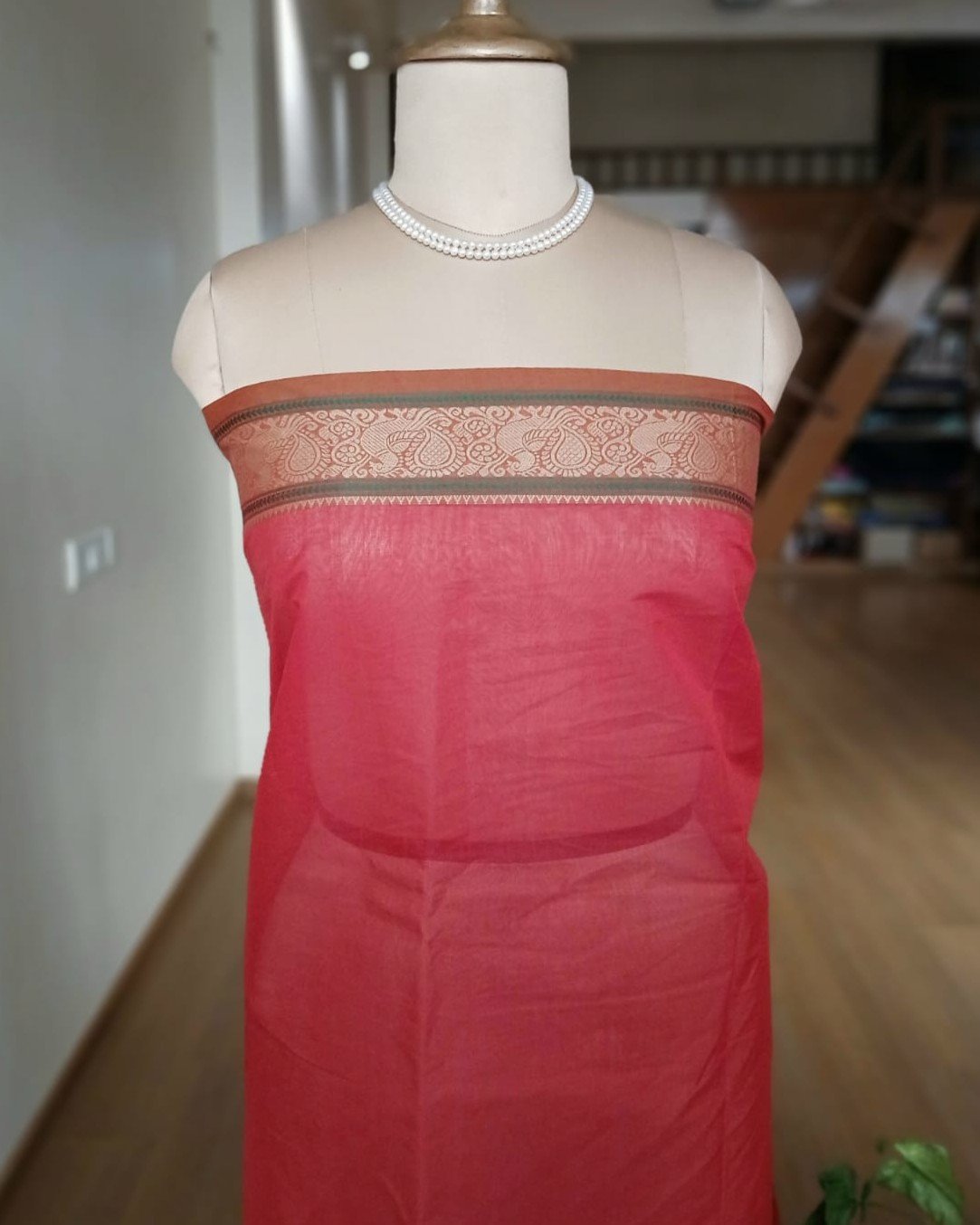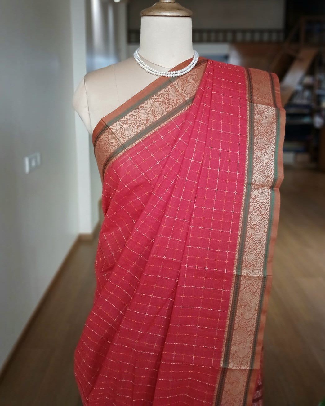 Kanchipuram handweave in cotton with beautiful threadwork border and palla. There is no zari in this saree.