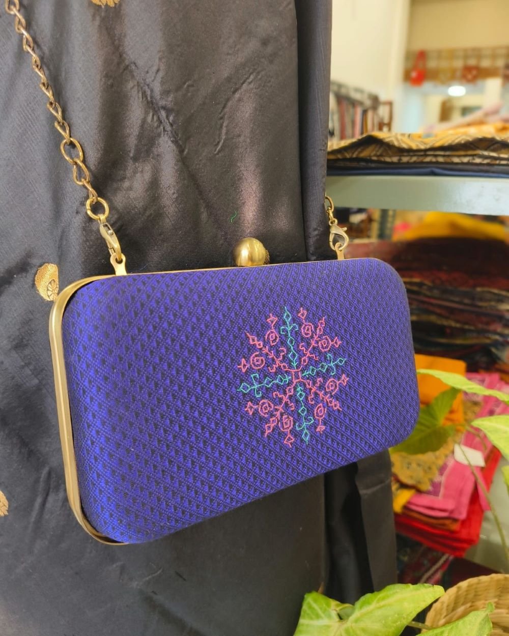 Kasuti hand embroidered clutch purses. The embroidery is done by women in Dharwad. Will fit a cell phone. Has a small side pocket flap inside. Chain handle and clasp are metal. The reverse side is plain.