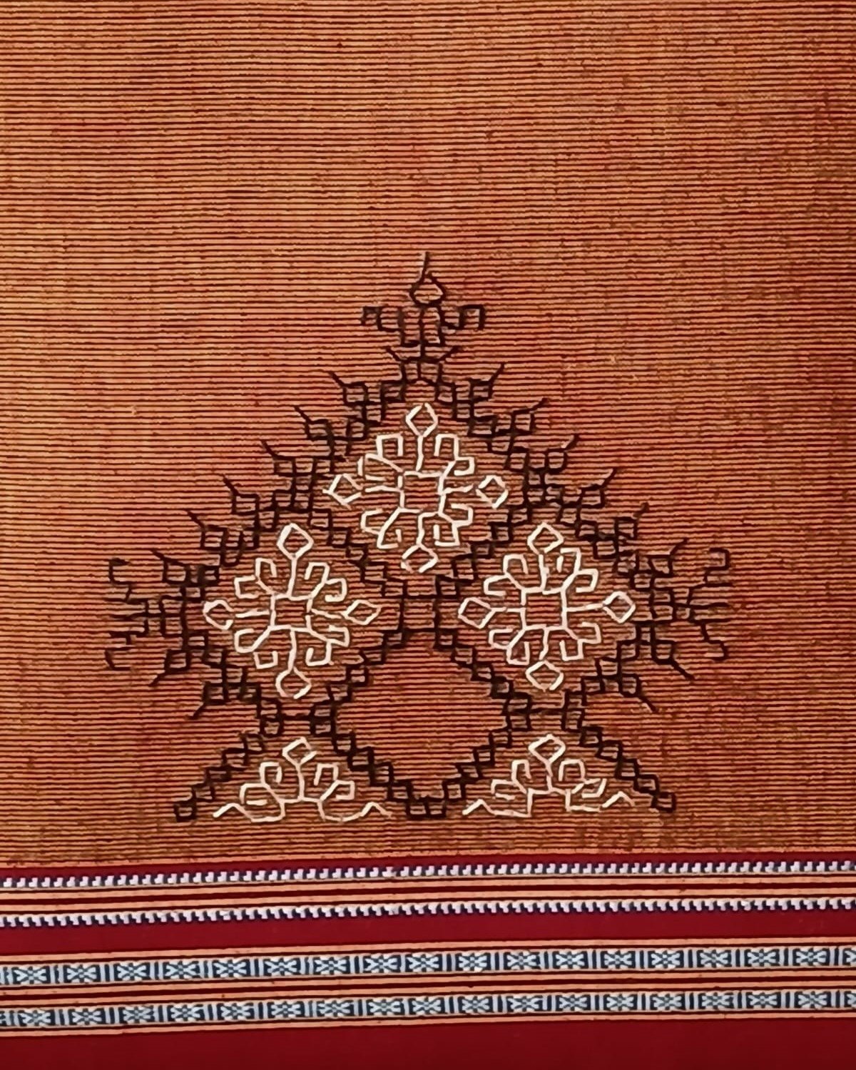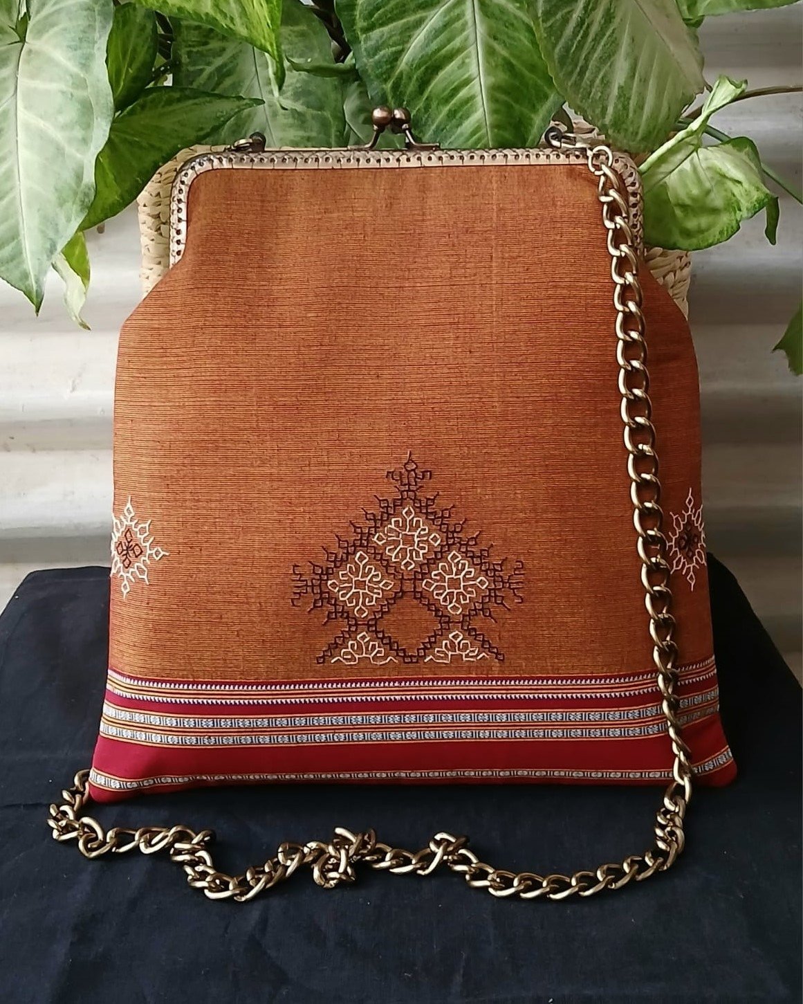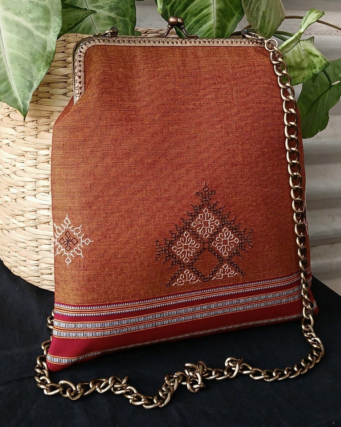 Kasuti Embroidered purse in cotton with hand embroidery done by women of Dharwad. Metal sling handle and clasp with antique finish. Will fit small mobile phone and other small items.