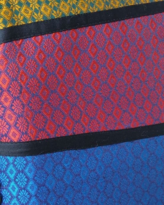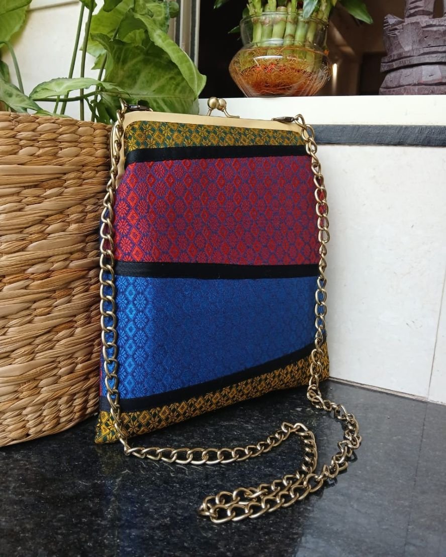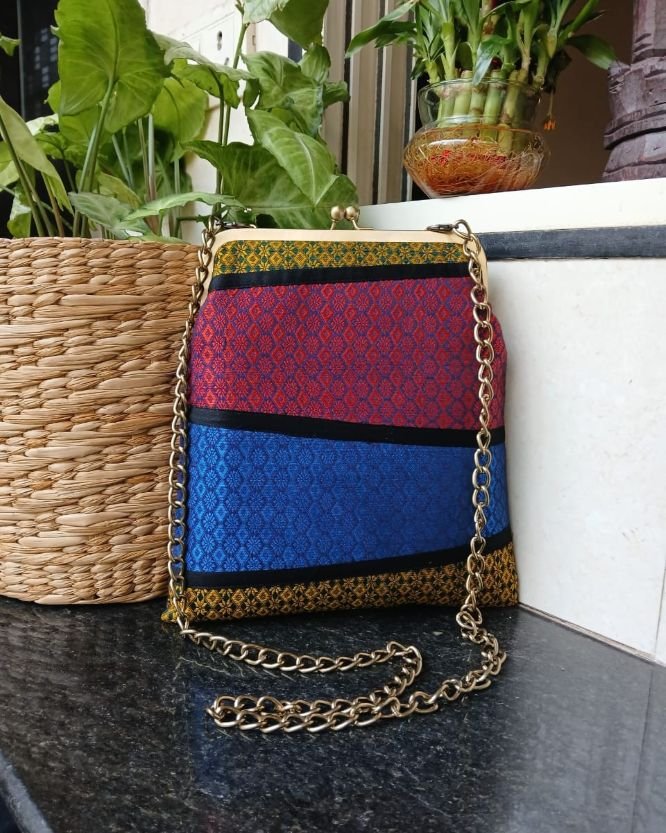 Handloom Khuna sling purse with asymmetric design. The base is cotton and the designs are in silk. Handwoven in Guledgudda.